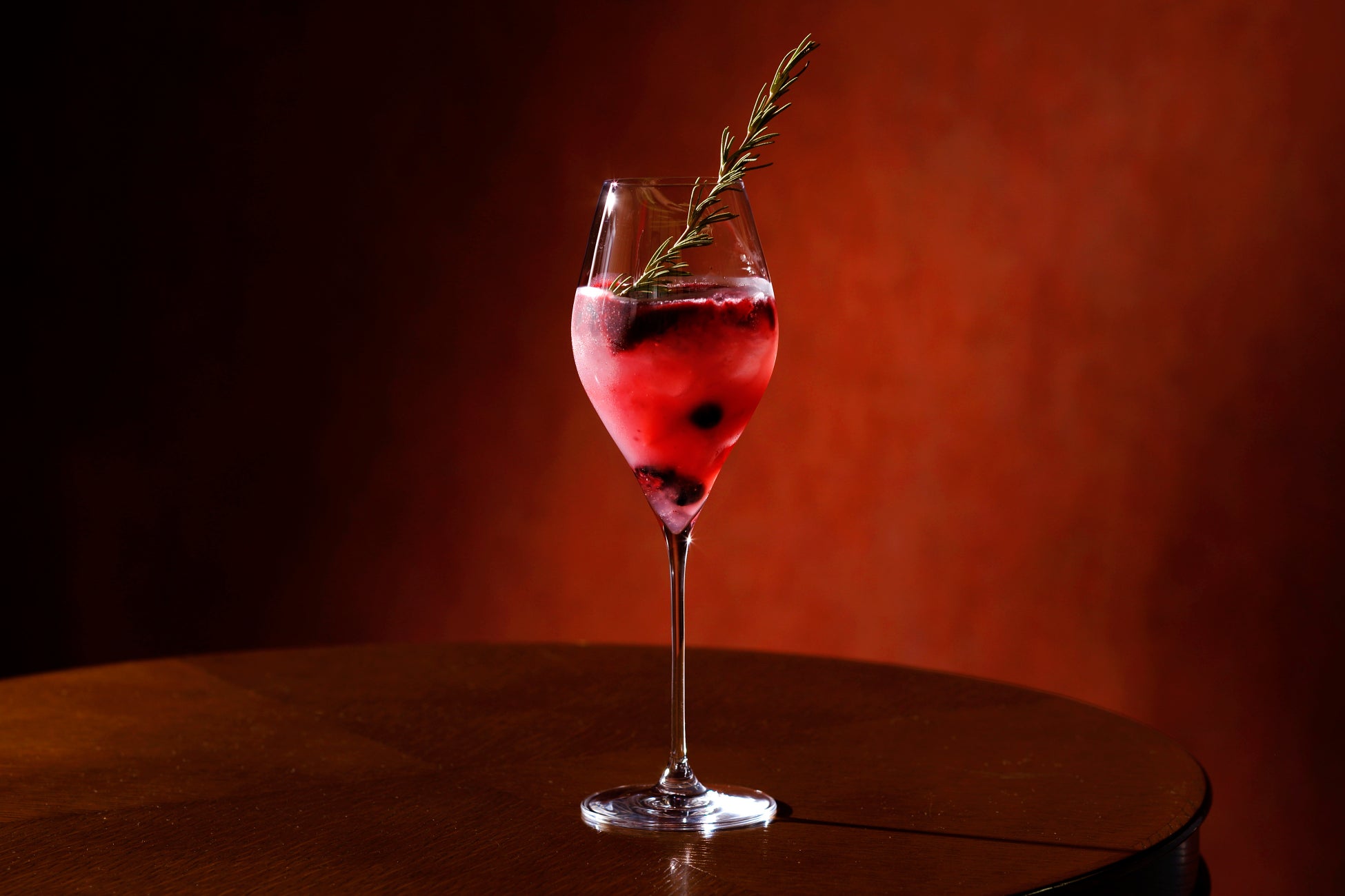 赤いベリーのジュレに、ラズベリー・ブルーベリー・ブラックベリー、3種のベリーが浮かぶ、愛らしくも魅惑的なカクテルです。