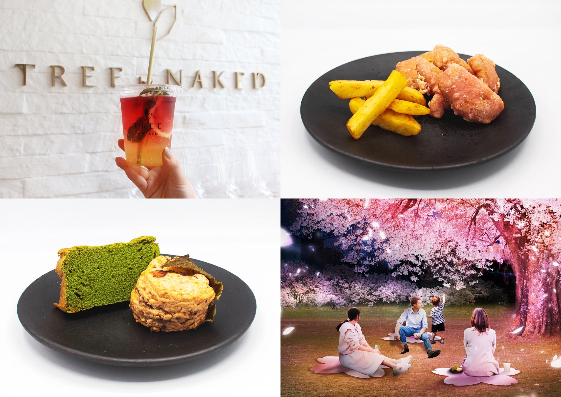 お花見のゴミ問題にも取り組むべく、提供する容器も環境に配慮したお花見メニューを、人気のレストラン「TREE by NAKED」が開発しました。お花見のお供になる、サステナブルなヴィーガンメニューを園内カフェ「NATIONAL PARKS CAFE Under the Tree」ならびにキッチンカーで販売します。お酒類の持込みがもともと禁止されている新宿御苑のお花見にふさわしいノンアルコールカクテルであるモクテルや、まるでチキンのような弾力ある食感と美味しさを楽しめるヴィーガンナゲット、ベーコンの代わりにみりん粕を使用した具沢山のヴィーガンチャウダースープ、桜餅のような味わいのさくら餅風スコーンなど、フード&スイーツ、ドリンクまで充実のメニューです。提供する際の容器やストローなどは、すべてバイオプラスチックや木、紙といった環境に配慮した素材を使用します。