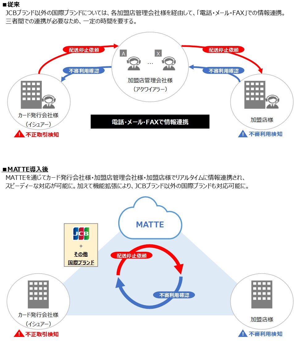 今回「MATTE」の機能拡張により、JCBブランド以外の国際ブランドの取引に関しても、対応が可能となります。具体的には、カード発行会社様での不正検知または、加盟店様での不審な利用を検知したタイミングで、「MATTE」を通じて加盟店様・カード発行会社様間でリアルタイムに情報連携や配送停止依頼が可能となります。