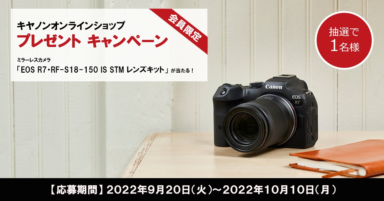 内容:応募期間中に会員ログインの上、アンケートにご回答いただいた方の中から抽選で1名様に、「EOS R7・RF-S18-150 IS STM レンズキット」をプレゼントいたします。