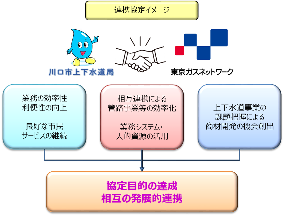 本協定では、令和5年4月から川口市上下水道事業におけるBPRについて、東京ガスネットワークが培ってきたノウハウを活かした支援により、業務の効率性・利便性向上と良好な市民サービスの継続を推進します。またライフライン事業者としての相互連携による管路事業等の効率化と、業務システム及び人的資源の活用についても検証を行います。