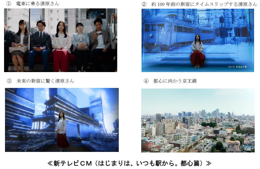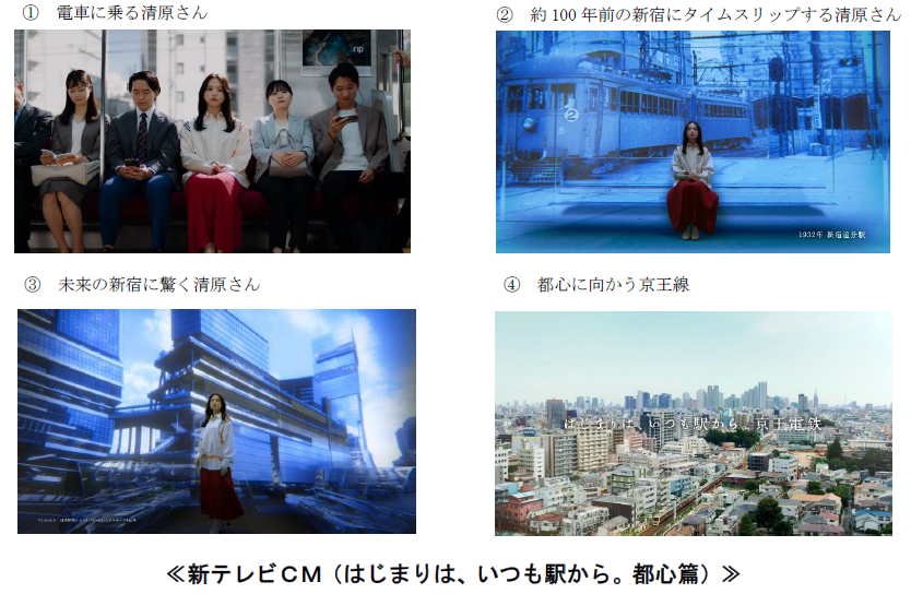 今回放映する「はじまりは、いつも駅から都心篇」では、清原さんが乗った電車に約100年前の新宿や創業時の京王プラザホテル、そして新しく開発が進む未来の新宿が映し出され、不思議な時間旅行の中で京王が携わってきたまちづくりを紹介します。
