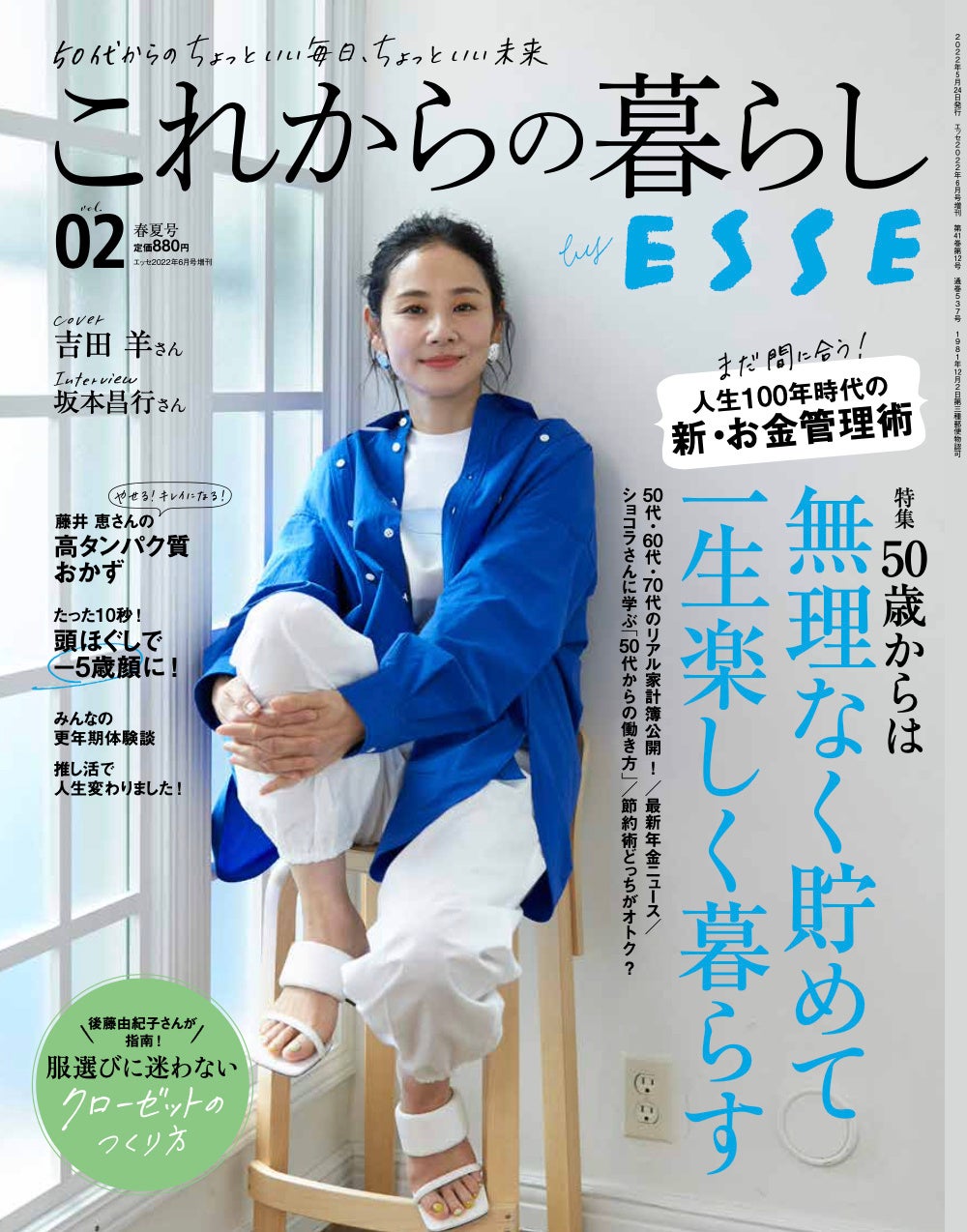 昨年秋に創刊した生活情報誌『これからの暮らし by ESSE』のvol.2が発売になります。“50代からのちょっといい毎日、ちょっといい未来”をキーワードに、大人の暮らしを応援します。表紙を飾ってくれたのは、女優の吉田羊さん。