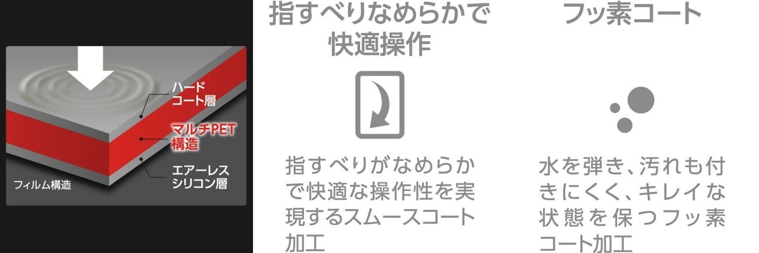衝撃を吸収するマルチペット層に加え、指紋防止やエアーレスなどの機能を持つ、高透明タイプの衝撃吸収フィルム(EF-MSL7MFLPG、EF-MSL7SFLPG)