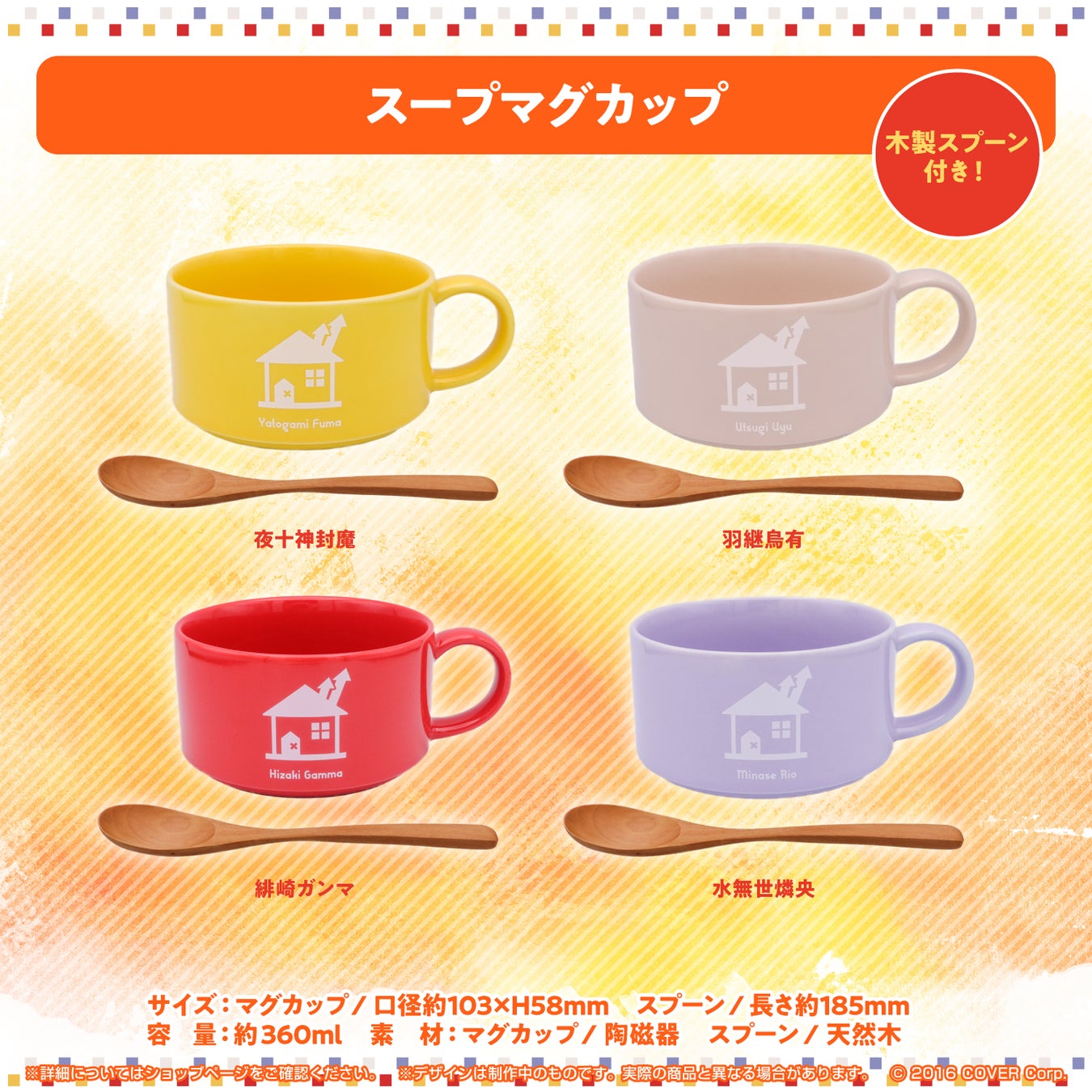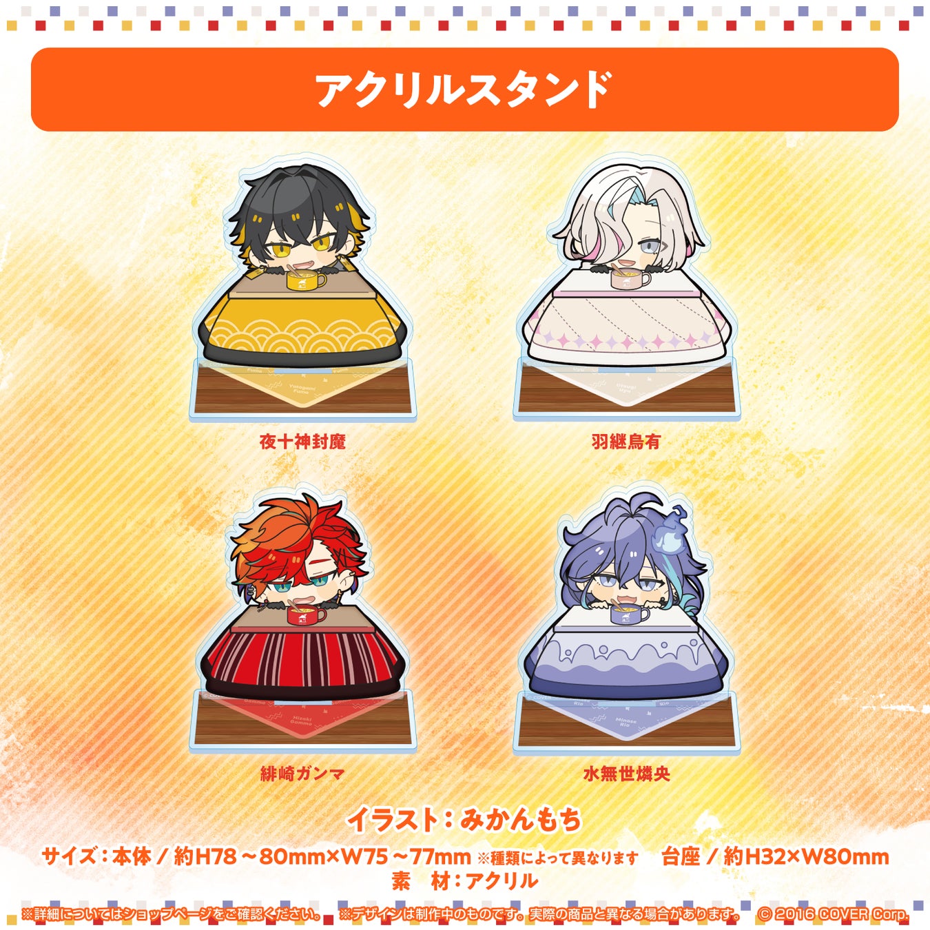 こたつでぬくぬくと暖まるメンバーを描いた「みかんもち」先生描き下ろしイラストを使用したアクリルスタンド、そしてイラストとお揃いの木製スプーンが付属した各メンバーカラーのスープマグカップの2アイテムをラインナップ。