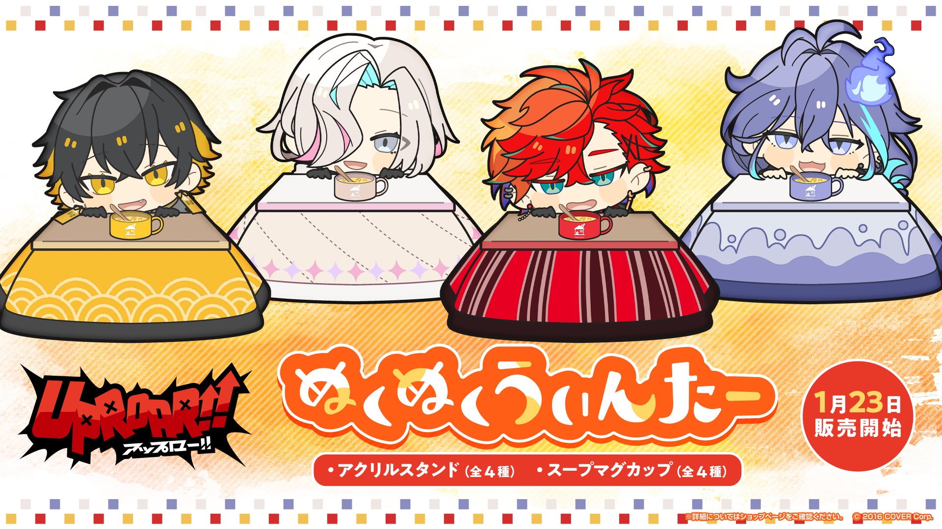 男性VTuberグループ「ホロスターズ」所属ユニット《UPROAR!!》から、「UPROAR!! ぬくぬくうぃんたー」グッズが、1月23日(月)19時より販売開始!