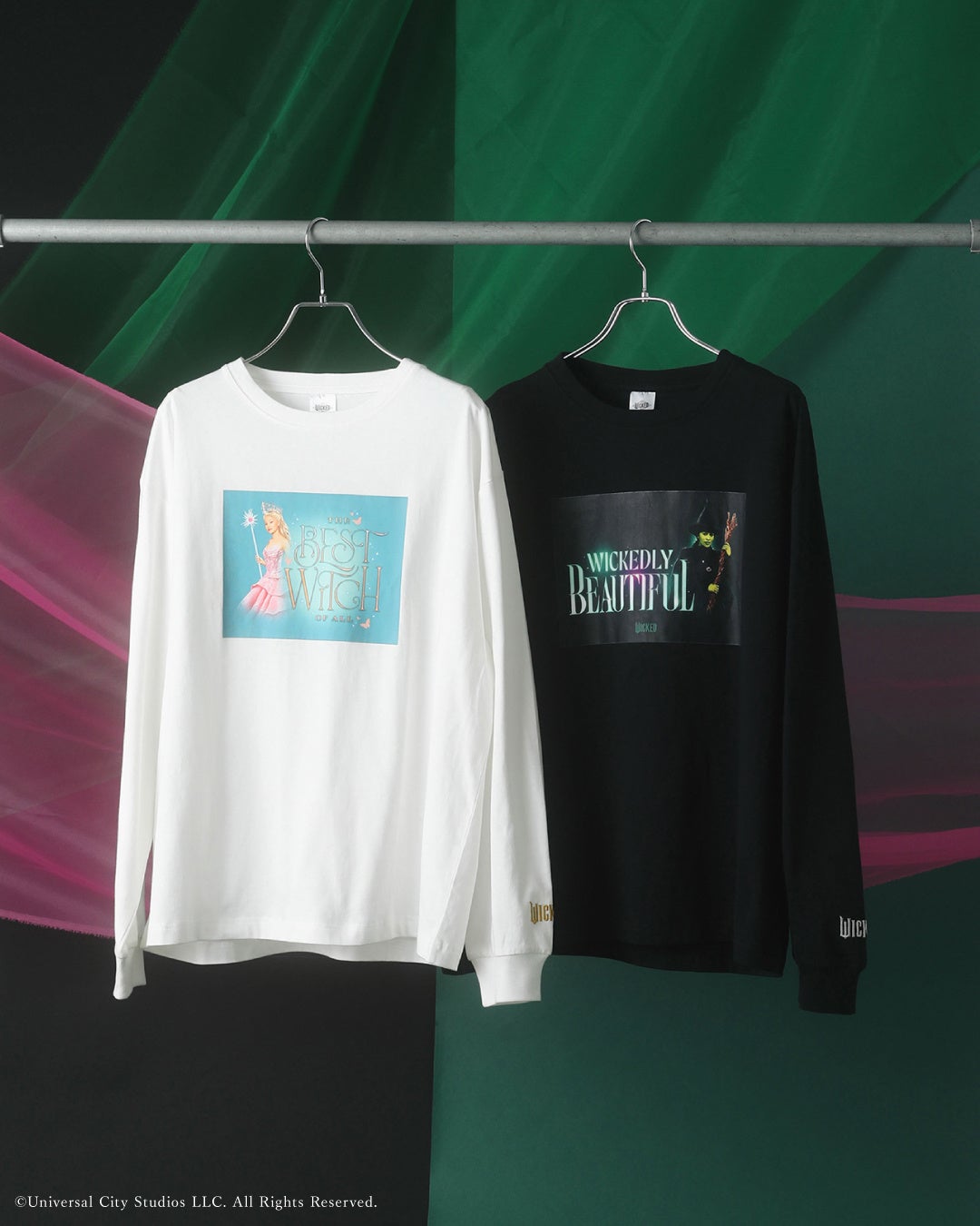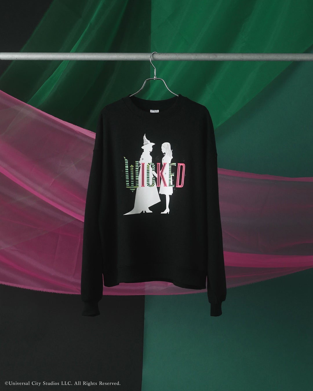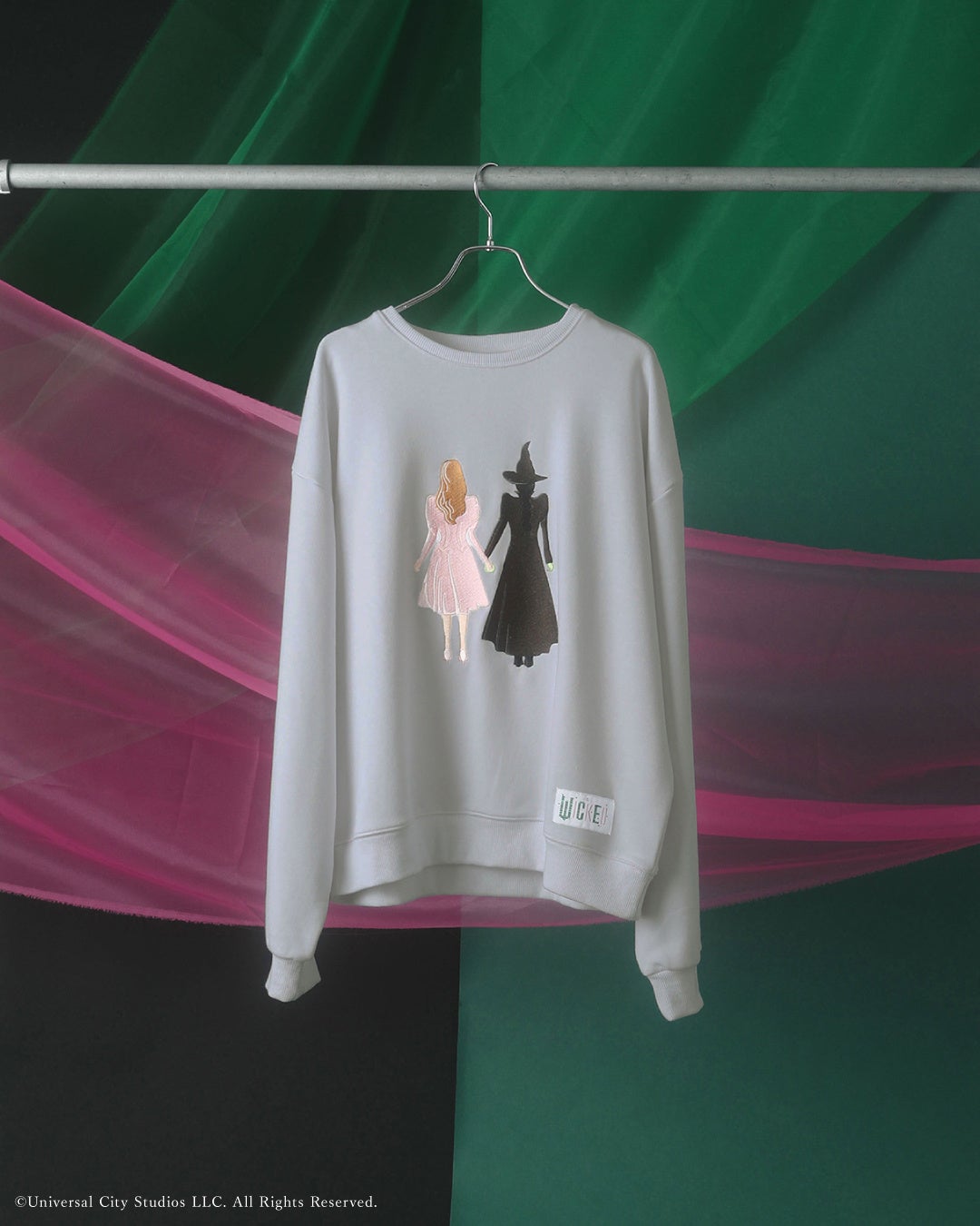映画のワンシーンや、ふたりの魔女のシルエットとタイトルロゴが印象的なトップスなど、『ウィキッド』の世界に引き込まれるようなアイテムをラインアップ。エルファバとグリンダがエメラルドシティへ旅立つ様子や、対照的でありながら友情を築くふたりの魔女を刺繍で施したデザインなど、カジュアルなスウェットとロンTに作品の世界観を落とし込みました。