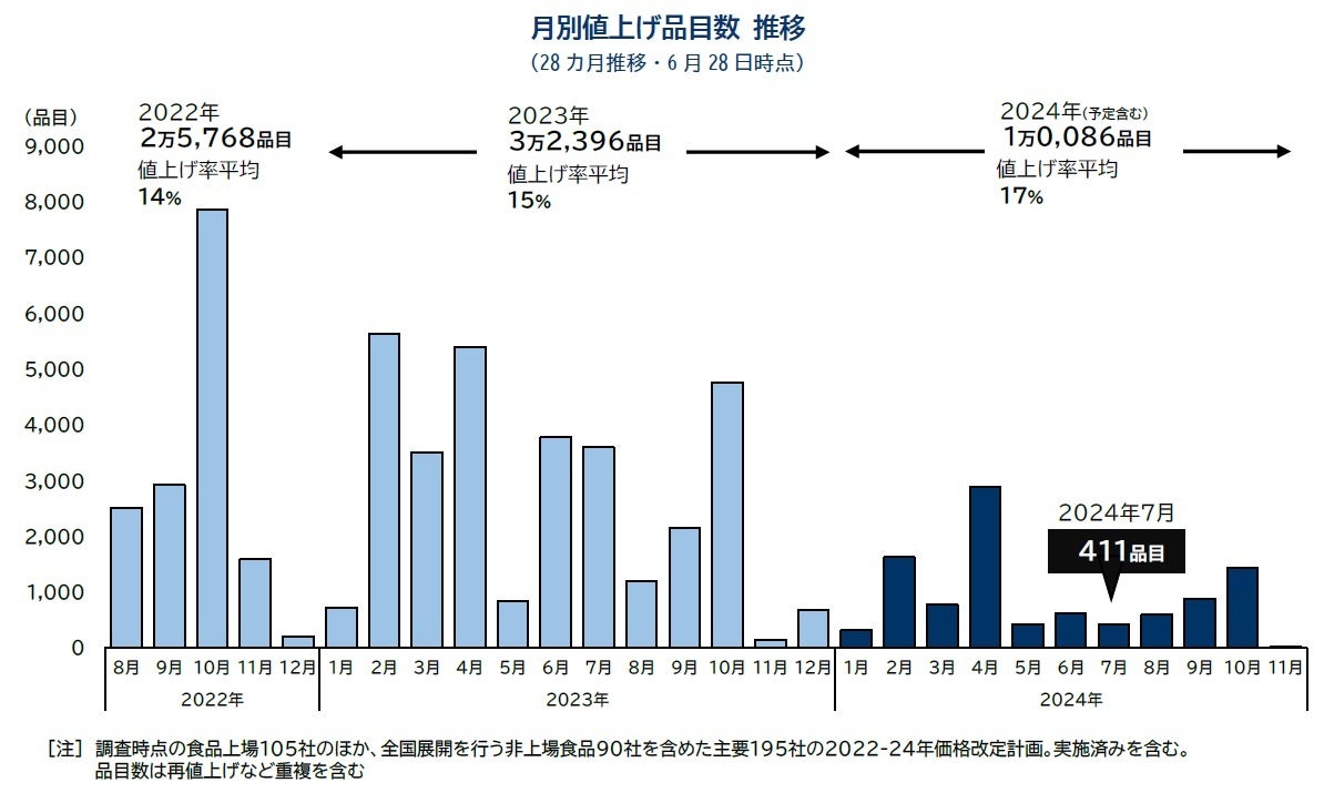 2024年の食品値上げ、1万品目突破 7月は411品目で値上げ 今秋に値上げラッシュの見通し