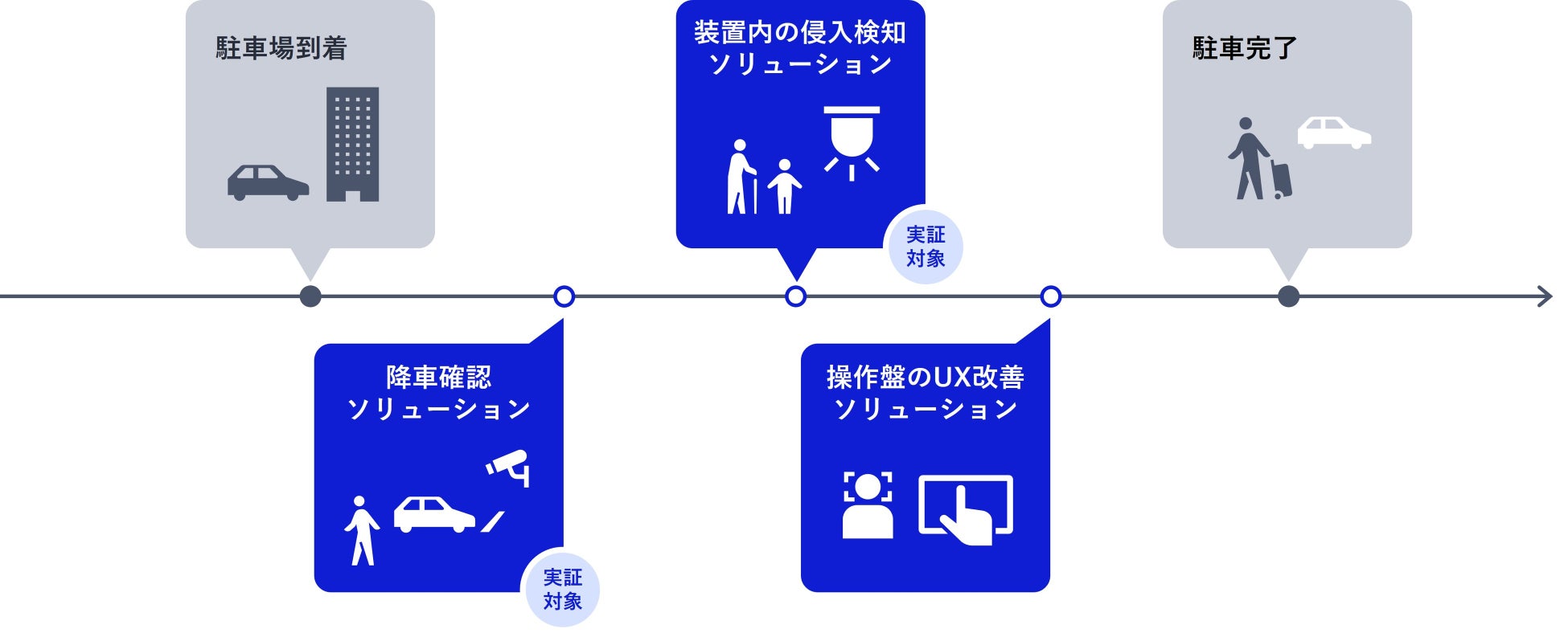 本実証は、港区のオフィスビルに併設されている機械式駐車施設で3月21日から開始します。夜間帯やその後の解析作業も含めて実証期間は約2か月を予定しており、AI技術搭載のカメラを用いた入庫時の降車確認(特許出願中2025年3月21日時点)と、入出庫時の駐車施設内への侵入検知に対する実現可能性を検証します。