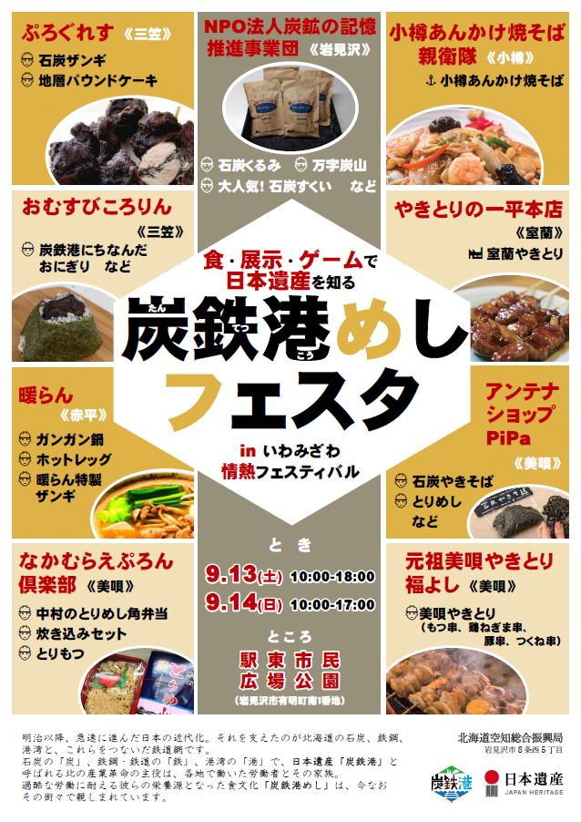 北海道空知総合振興局では、日本遺産「炭鉄港」とその食文化「炭鉄港めし」の認知度向上及びその魅力を生かした誘客促進に向け、安平町及び岩見沢市で開催されるイベントに、炭鉄港めしブースを出展します。