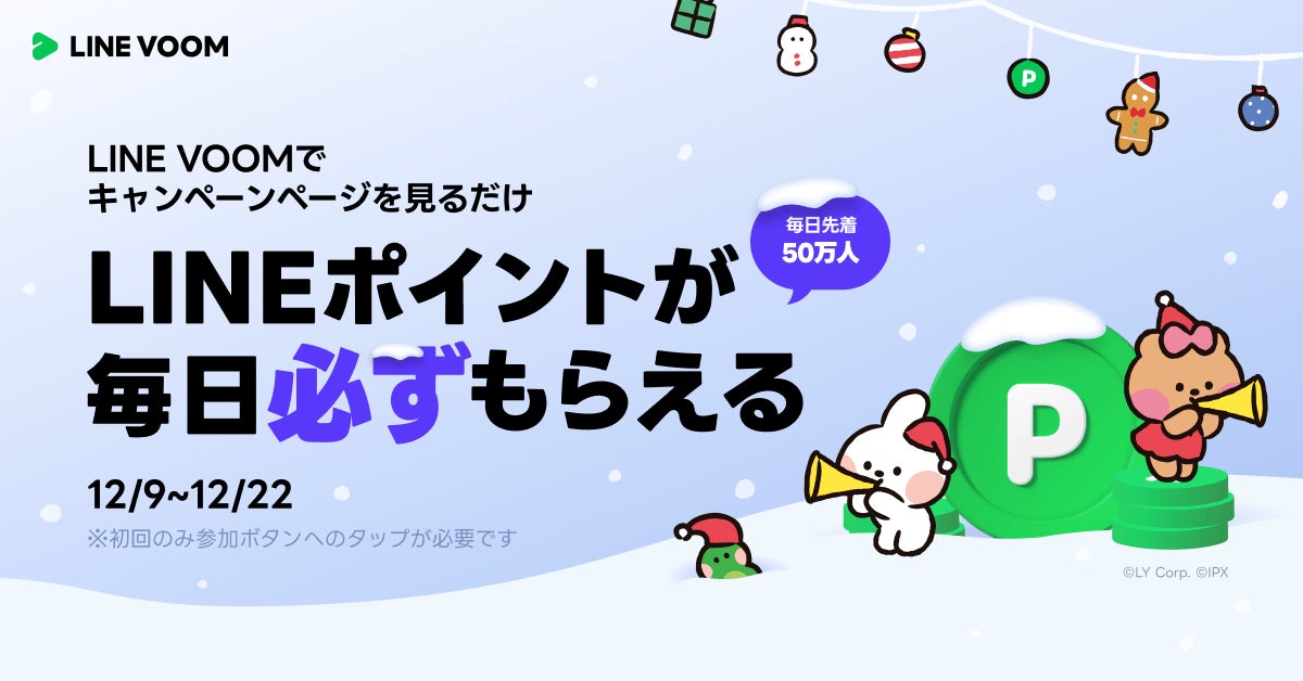 LINEヤフー株式会社は、「LINE」内のショート動画プラットフォーム「LINE VOOM」にて、2024年12月9日(月)より、毎日先着50万人にLINEポイントをプレゼントするキャンペーンの第4弾を開催します。