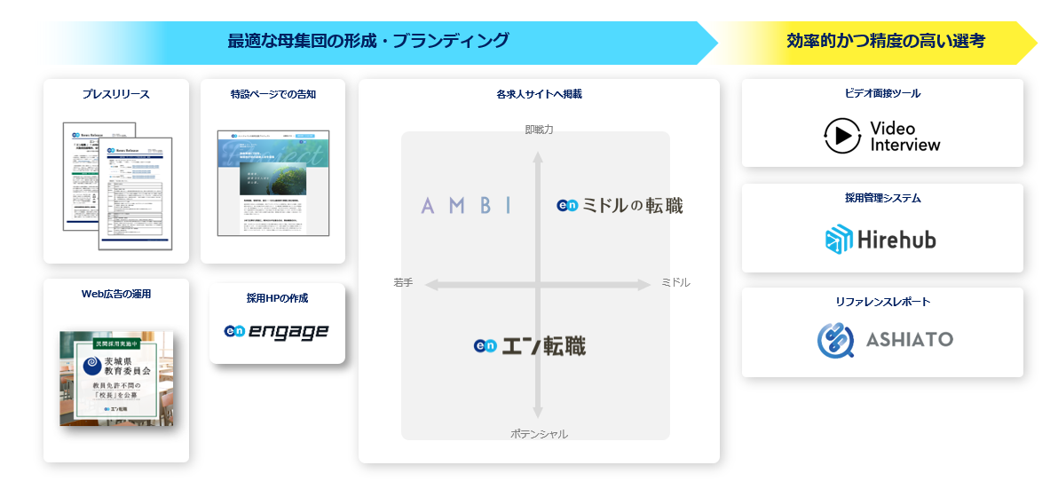 プレスリリースや特設ページ、『engage』を用いた採用HPの作成Web広告での告知に加え、各求人サイトでの集客を支援。『エン転職』『AMBI』『ミドルの転職』とターゲットの異なる3つの求人サイトを活用することで、ターゲットへ網羅的に求人をお届けします。さらにビデオ面接ツール『Video Interview』、採用管理システム『Hirehub』、リファレンスレポート『ASHIATO』の提供により、選考フローを支援し、求職者との適切なマッチングを実施します。