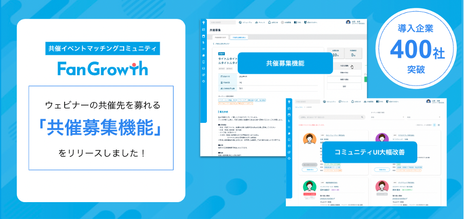 さらに、共催企業を完全無料でお探しいただけるコミュニティ機能では検索画面のデザインリニューアルを実施し、導入企業は400社を突破しました。
