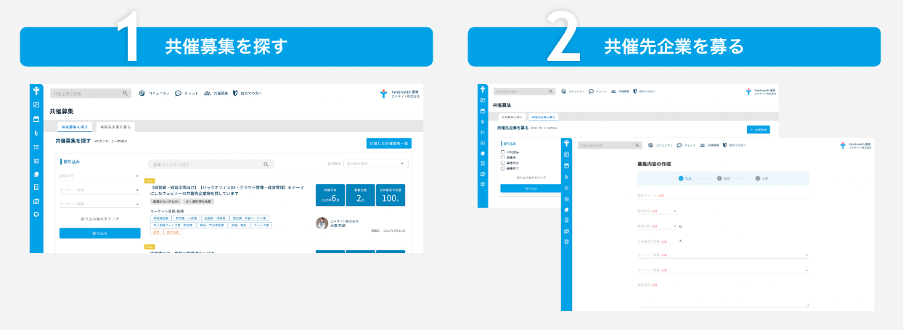 募集する企業は、掲示板を作成し、ターゲットや内容などを詳細に記載して、共催企業を募集することができます。