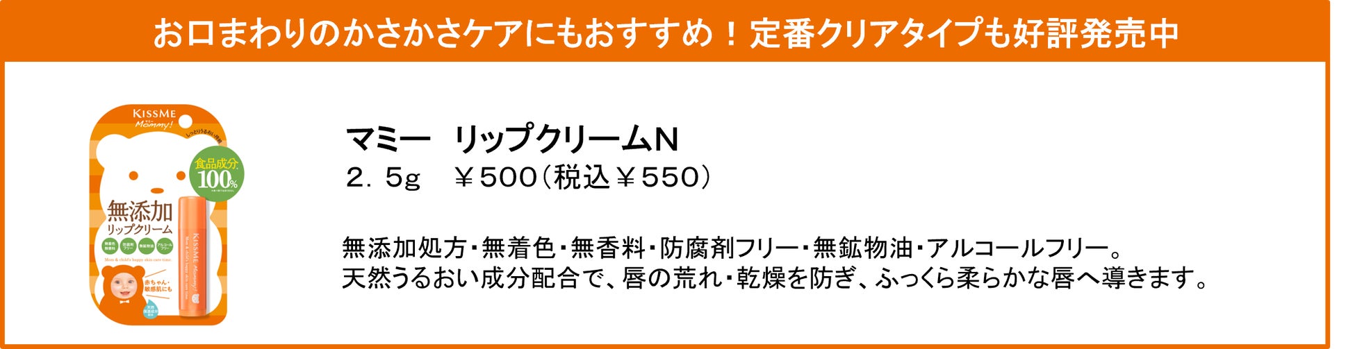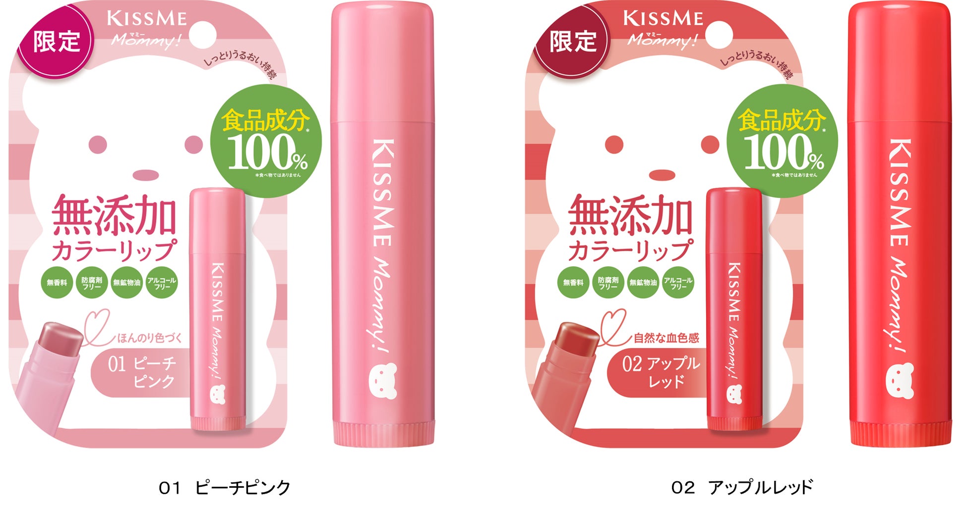 食品成分※1にこだわった親子で楽しく使えるスキン&ボディケアシリーズ「キスミー マミー」から、ケアしながら色づく低刺激性※3カラーリップ2色が数量限定登場。