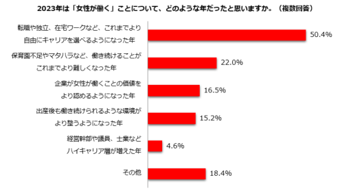有効求人倍率は1倍を超え続け、失業率は2%台をキープした2023年。主婦層を中心とする就労志向の女性に、「2023年を振り返って、2022年より「女性が働きやすくなった」実感はありますか」と尋ねたところ「ない」と回答した人が70.4%でした。ただ、2年前は77.9%と8割近かったものの、徐々に減少傾向にあります。一方、「ある」と回答した人にそう思う理由を尋ねたところ、「働く女性の数が増えてきた」が6割近くとなりました。こちらも直近3年でじわりと増加しており、働く女性の増加が女性の働きやすさの実感値に結びついているように感じます。また、「2023年は「女性が働く」ことについて、どのような年だったと思いますか」との質問には、過半数が「転職や独立、在宅ワークなど、これまでより自由にキャリアを選べるようになった年」と回答しました。ネガティブな声よりポジティブな声が上回っています。たた「その他」に寄せられたフリーコメントには、「何も変わらない」という声が多く寄せられました。