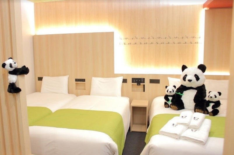 「変なホテル東京 浅草田原町」をご利用いただくお客様の多くは、ホテル近隣の浅草や上野へ観光に行かれます。そこで、浅草・雷門をイメージした唐紅色のホテル館内のデザインに加えて、客室内をパンダで装飾した“パンダルーム”をつくり、観光とあわせてホテルステイもお楽しみいただければと考えております。“パンダルーム”には、人形の老舗、株式会社 吉德(本社:東京都台東区)が手掛ける65センチの特大サイズのパンダのぬいぐるみを1体と小さいパンダのぬいぐるみを2体設置、ベッドカバー・枕カバー・タオル・クッションなどをパンダ模様で飾り、お子様にはパンダ柄のパジャマもご用意いたします。“パンダルーム”にはベッド3台・テレビ2台・ソファセットを完備、バスルームと洗面台・トイレは別々のつくりでバスタブも付いております。ご宿泊のお客様には、恩賜上野動物園を含む東京を中心とする101の施設に入場可能な “東京・ミュージアム ぐるっとパス2022”が付いており、東京観光もお楽しみいただけます。“パンダルーム”の価格は、朝食付25,000円~、素泊まり22,000円~(いずれも1泊1部屋、朝食付/税サ込)