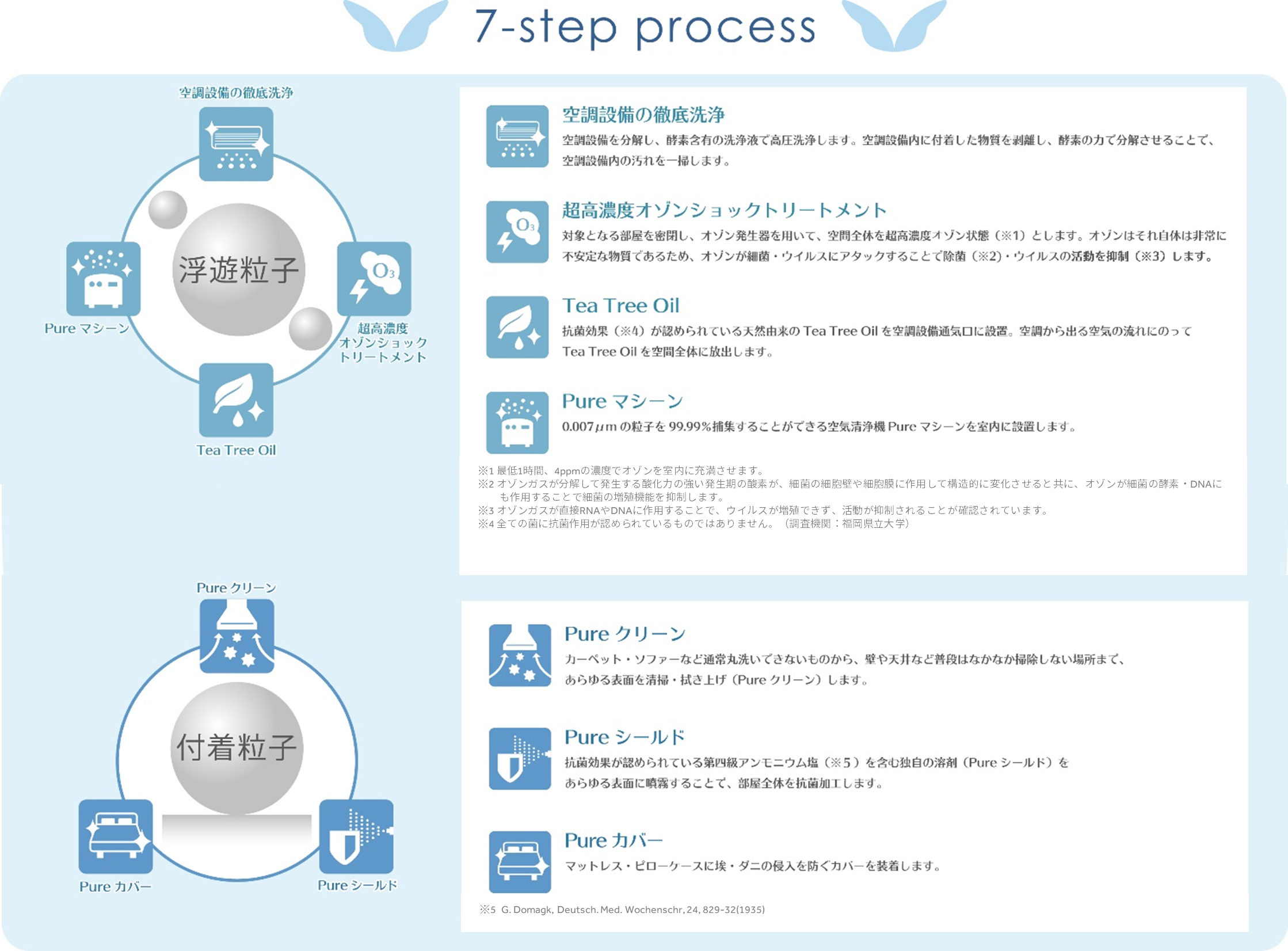 ※「7-step process(セブン ステップ プロセス)」(次項参照)と呼ばれる、米国特許取得済(US7767141B2)の室内清浄工程。空調設備の徹底洗浄、超高濃度オゾンショックトリートメント、Tea Tree Oil(ティー ツリー オイル)、Pureマシーン、Pureクリーン、Pureシールド、Pureカバーの7工程を指します。