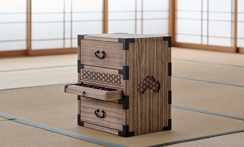 軽くて燃えにくい 桐の箪笥は、下町の火事の際、物をまとめて運ぶための知恵として生まれたといわれています。「祝いごとに箪笥を贈る」という文化にも着目し、子どものための大切なものをしまう小さな箪笥の引き出しに、知育玩具としての鍵盤をあしらいました。 ※講談のなかで音を奏でます