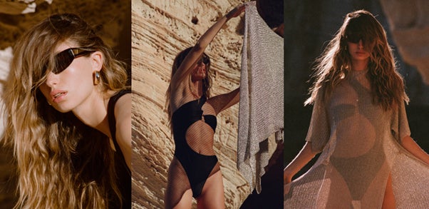 キーアイテムとして、太陽の光にきらめくハイネック×クリスクロスバックのゴールドワンピースをはじめ、ドラマティックなブラックのアシンメトリーワンショルダー・スイムスーツ、構築的なシルバーホルターネック・ビキニが登場します。さらに、シルバーのアクセントを効かせたブラックのステートメントサングラスや、大胆なイヤリング、ヒップにツイストディテールをあしらったゴールドのニットカバーアップなどが含まれています。