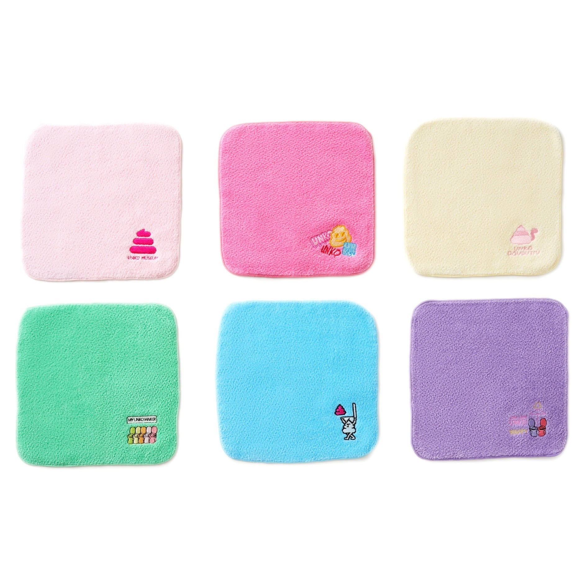 「うんこミュージアム」のモチーフ6種がふわふわの刺繍ハンドタオルに。