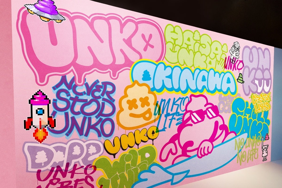 壁一面に描かれた、うんこのストリートアートです。沖縄では「OKINAWA」や「HAISAI UNKO」の文字など、沖縄限定のグラフィックとなっています。