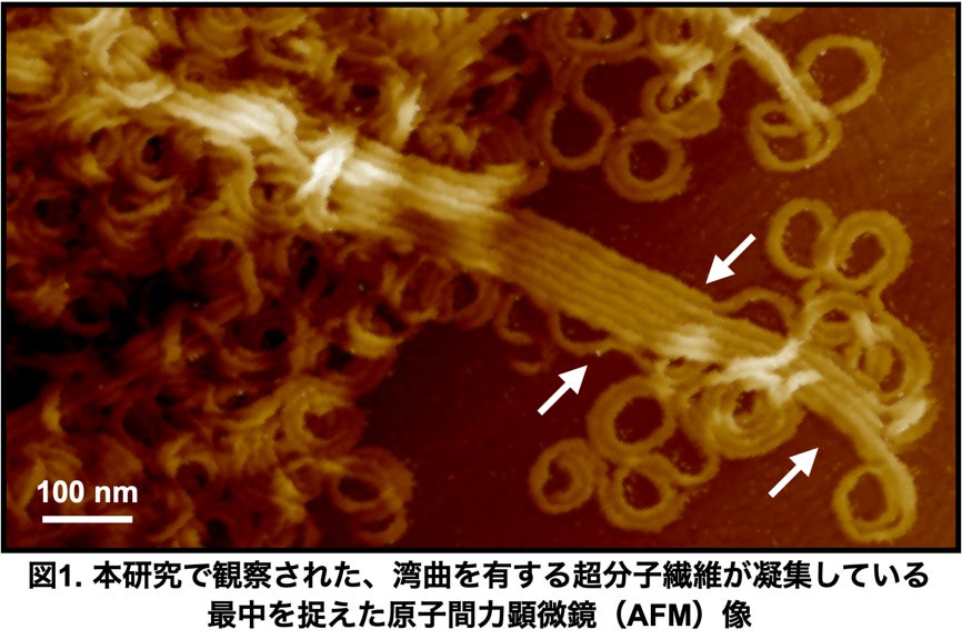今回、研究チームは、フォールディングと凝集の両方の過程が競合して起こる光応答性超分子ファイバーの開発に成功し、その過程をAFMにより直接観察しました(図1)。