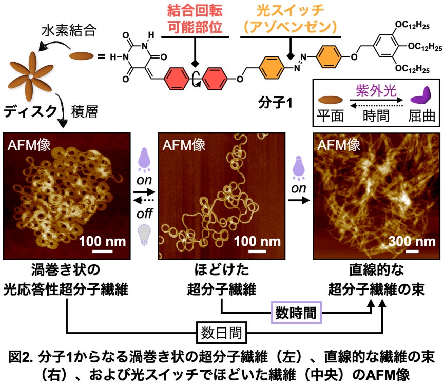 これまでの研究成果を踏まえ、研究チームは結合回転によりディスクの平面性が変化しうる新たな分子1を合成しました(図2)。さらに、任意のタイミングで平面性を変化させられるように、紫外光で折れ曲がる光応答性分子「アゾベンゼン」を導入しました。有機溶媒中で分子1を自己集合させると、調製直後は渦巻き状に折りたたまれた超分子繊維が形成されました。しかし、この溶液を室温で数日間静置すると、湾曲を失った直線的な繊維の束への構造転移による沈殿形成が観察されました。沈殿が生じ始めた直後のAFM観察から、渦巻き状の主鎖がほどけながら繊維間で凝集していく中間状態が観察されました(図1)。
