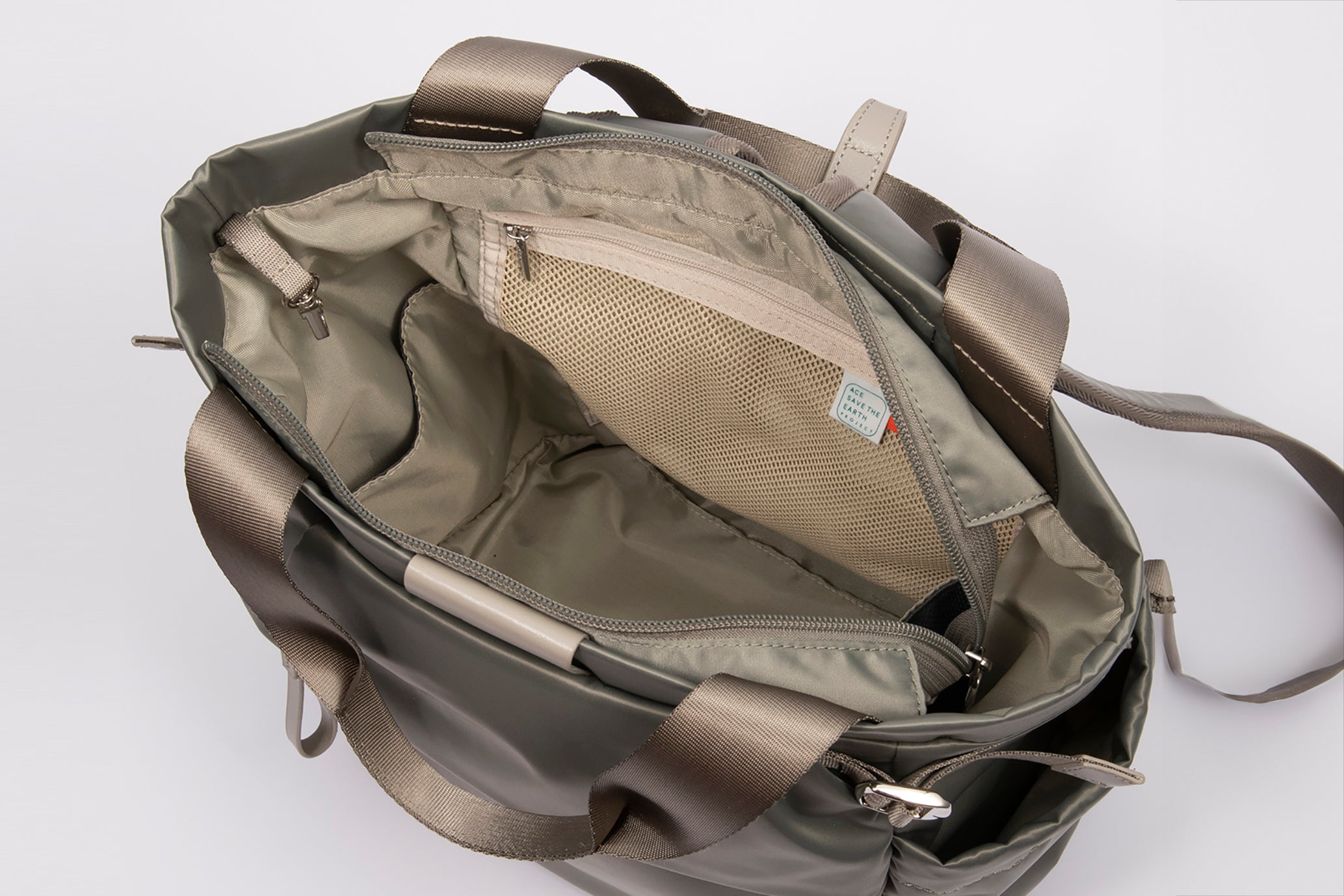外装に、生産過程に発生する廃材を再生した100%リサイクルナイロン「Mipanregen®」※を、内装に「リサイクルポリエステル」を使用。