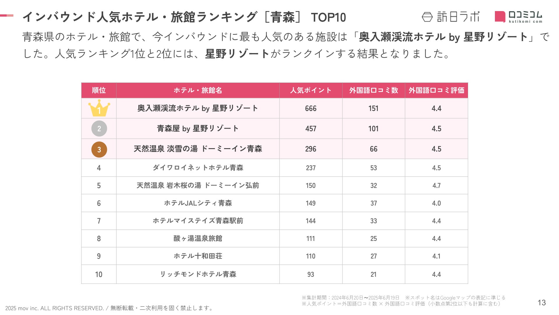 業界最大級のインバウンドビジネスメディア「訪日ラボ」及び 店舗向け集客一元化プラットフォーム「口コミコム」を運営する株式会社mov(代表取締役:渡邊 誠、本社:東京都渋谷区、以下mov)は、青森県のホテル・旅館に寄せられた最新の口コミデータから、独自の『インバウンド人気ホテル・旅館ランキング』を発表しました。