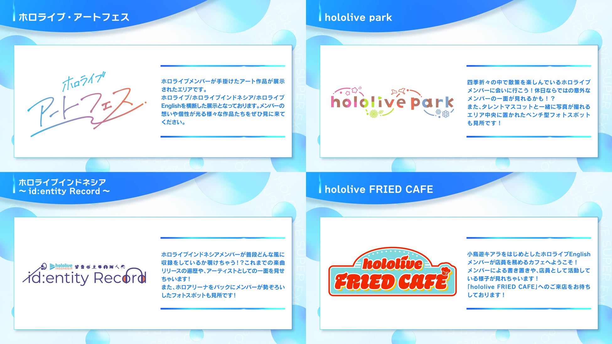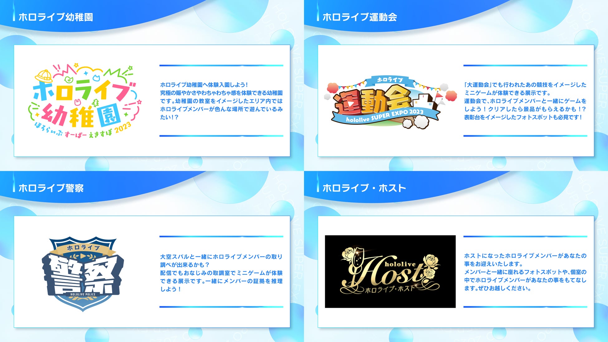 ホロライブメンバーの人気配信企画を元にした「ホロライブ幼稚園」「ホロライブ運動会」「ホロライブ警察」「ホロライブ・ホスト」が体験ブースとして登場。またホロライブインドネシアや、ホロライブEnglishのオリジナルブースも登場する盛りだくさんな内容となっております。