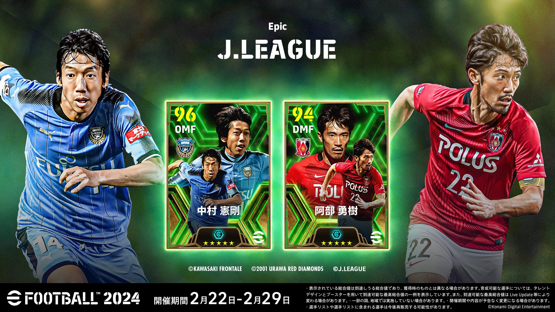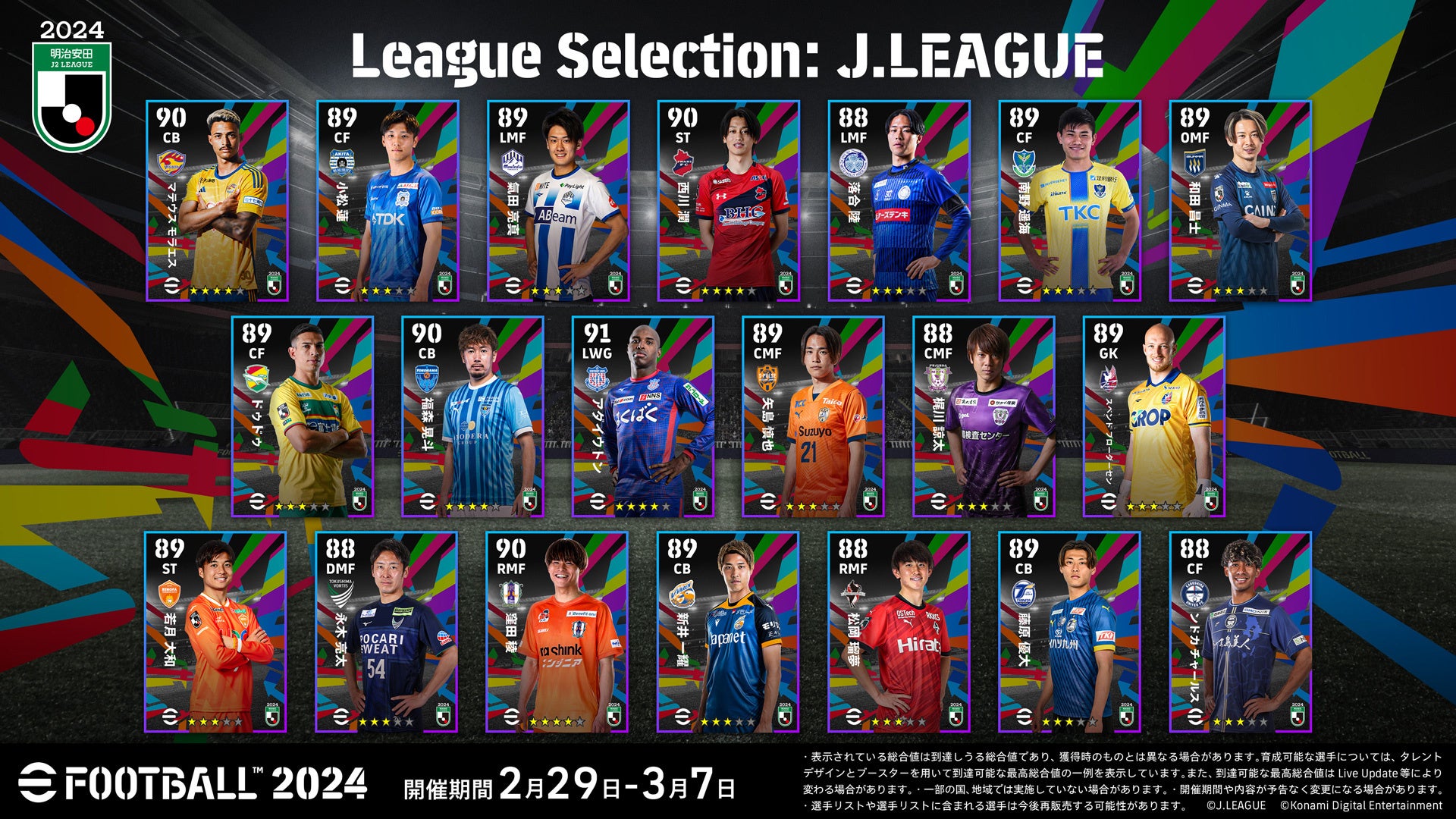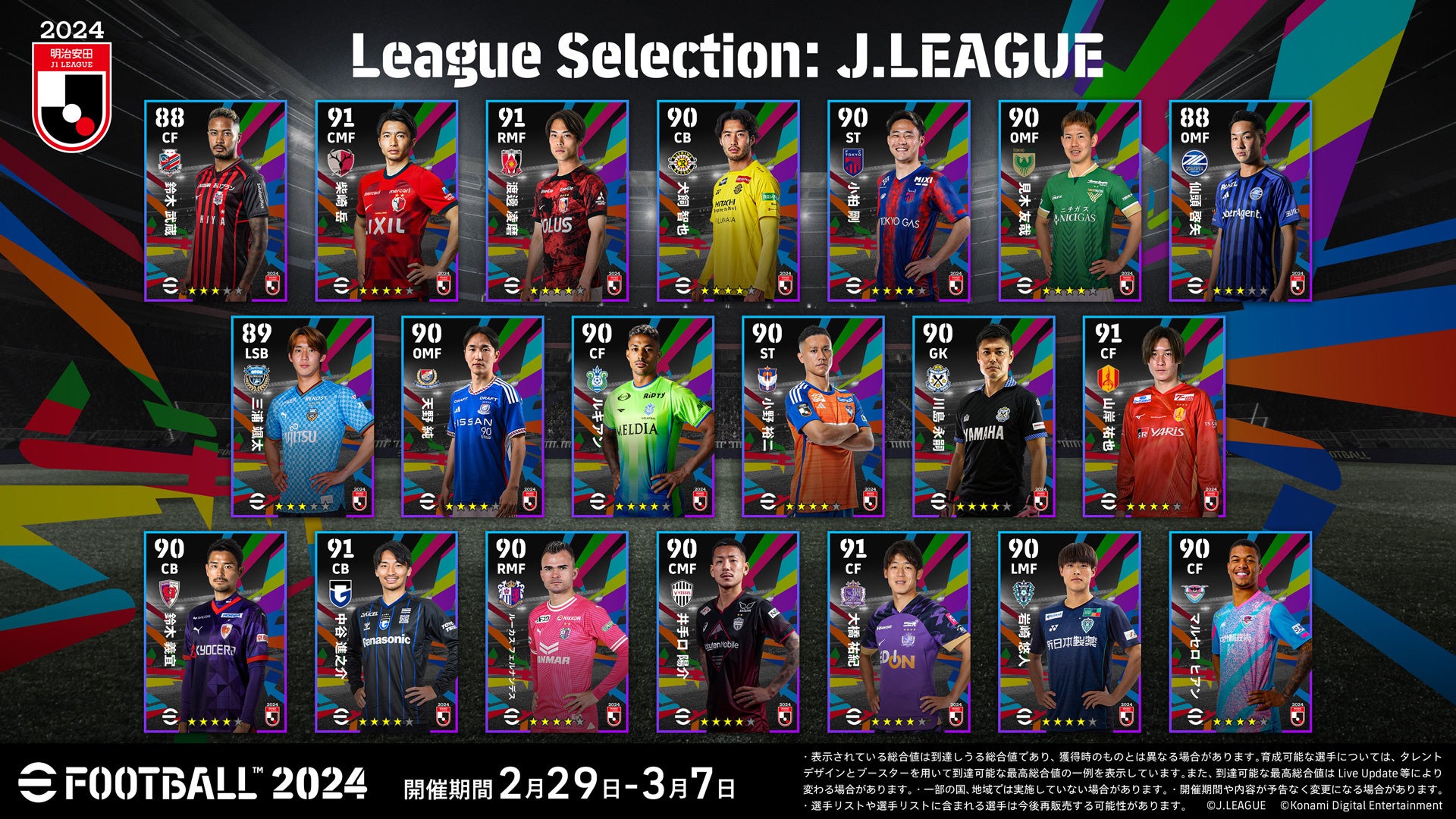 2月29日(木)からの「eJリーグ eFootball™ 2024 シーズン」開幕を記念して、「League Selection」にJ1・J2全40クラブから総勢80名の選手が2週にわたって登場! 2/29(木)からの第一弾では、ヴィッセル神戸 井手口 陽介選手、横浜F・マリノス 天野 純選手など総勢40名が登場!