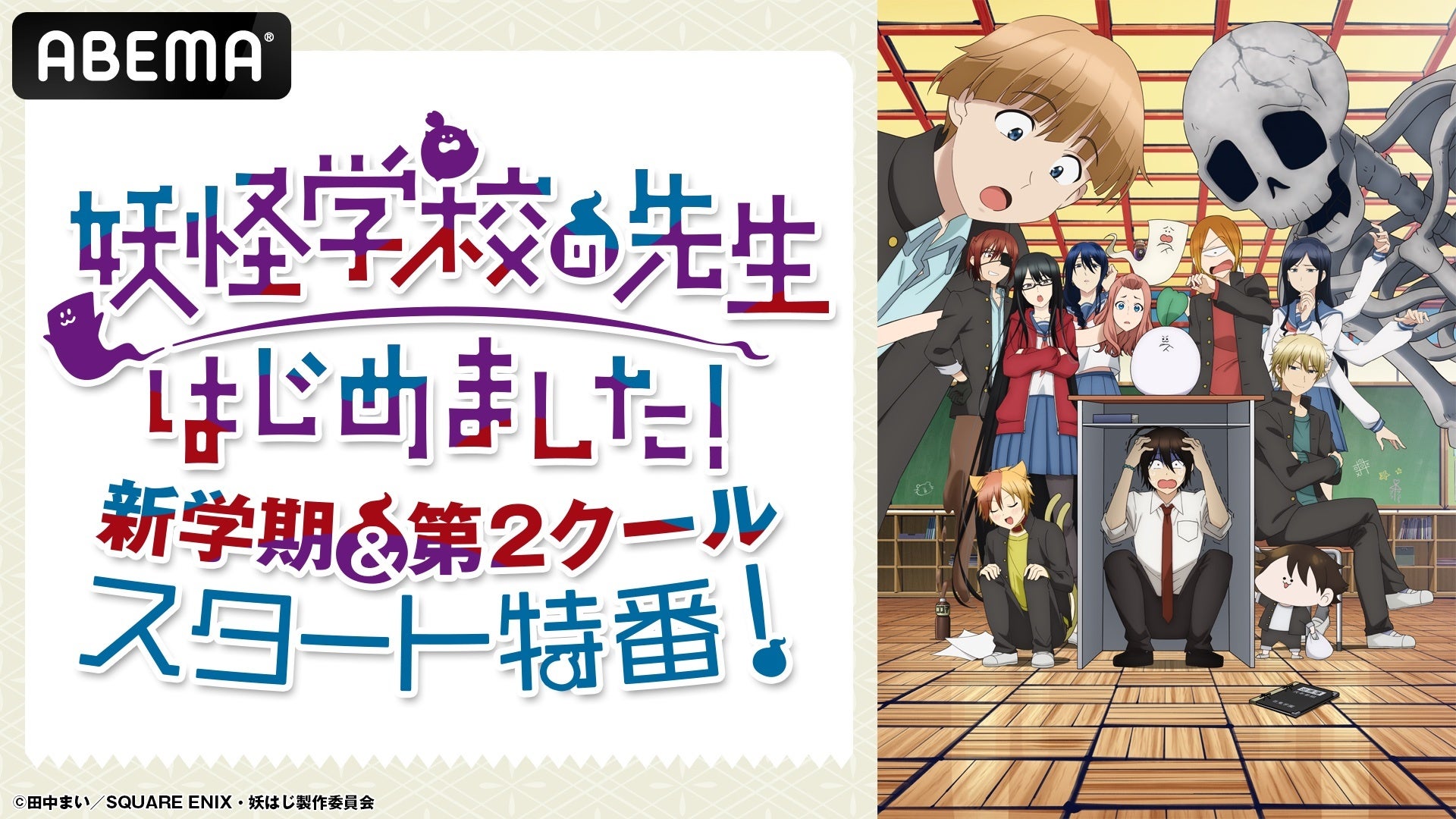 新しい未来のテレビ「ABEMA」は、特別番組「『妖怪学校の先生はじめました!』新学期&第2クールスタート特番!」を、2025年1月7日(火)夜8時より独占無料生放送いたします。