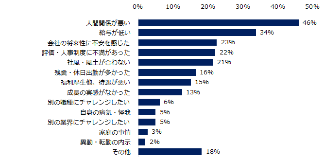 退職時に「会社に伝えなかった”本当の退職理由”がある」と回答した方に、会社に伝えなかった本当の退職理由を伺うと「人間関係が悪い」が46%で最多でした。