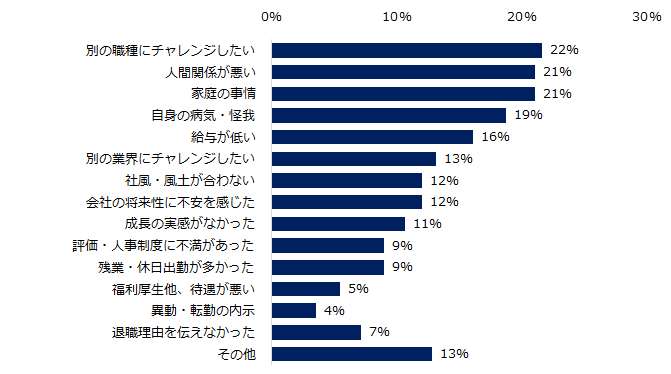 退職時に、会社に伝えた退職理由を伺うと「別の職種にチャレンジしたい」が22%で最多でした。