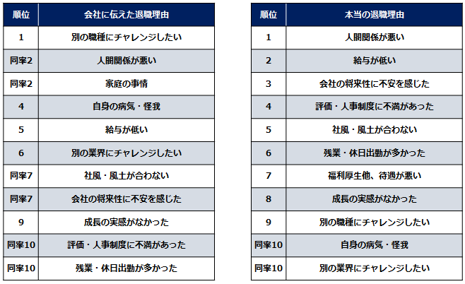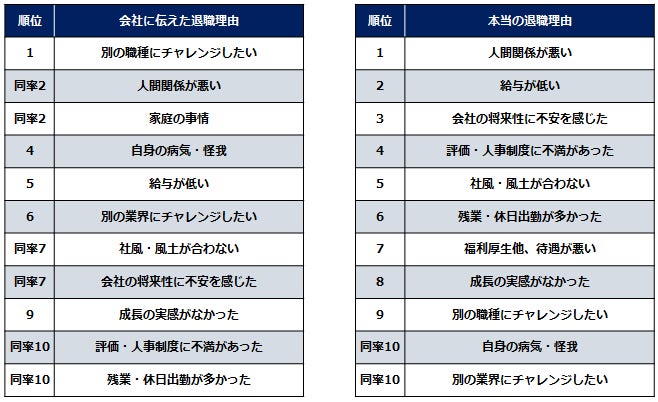 ★ 会社に伝えた退職理由、第1位は「別の職種にチャレンジしたい」。会社に伝えなかった本当の退職理由、第1位は「人間関係が悪い」。