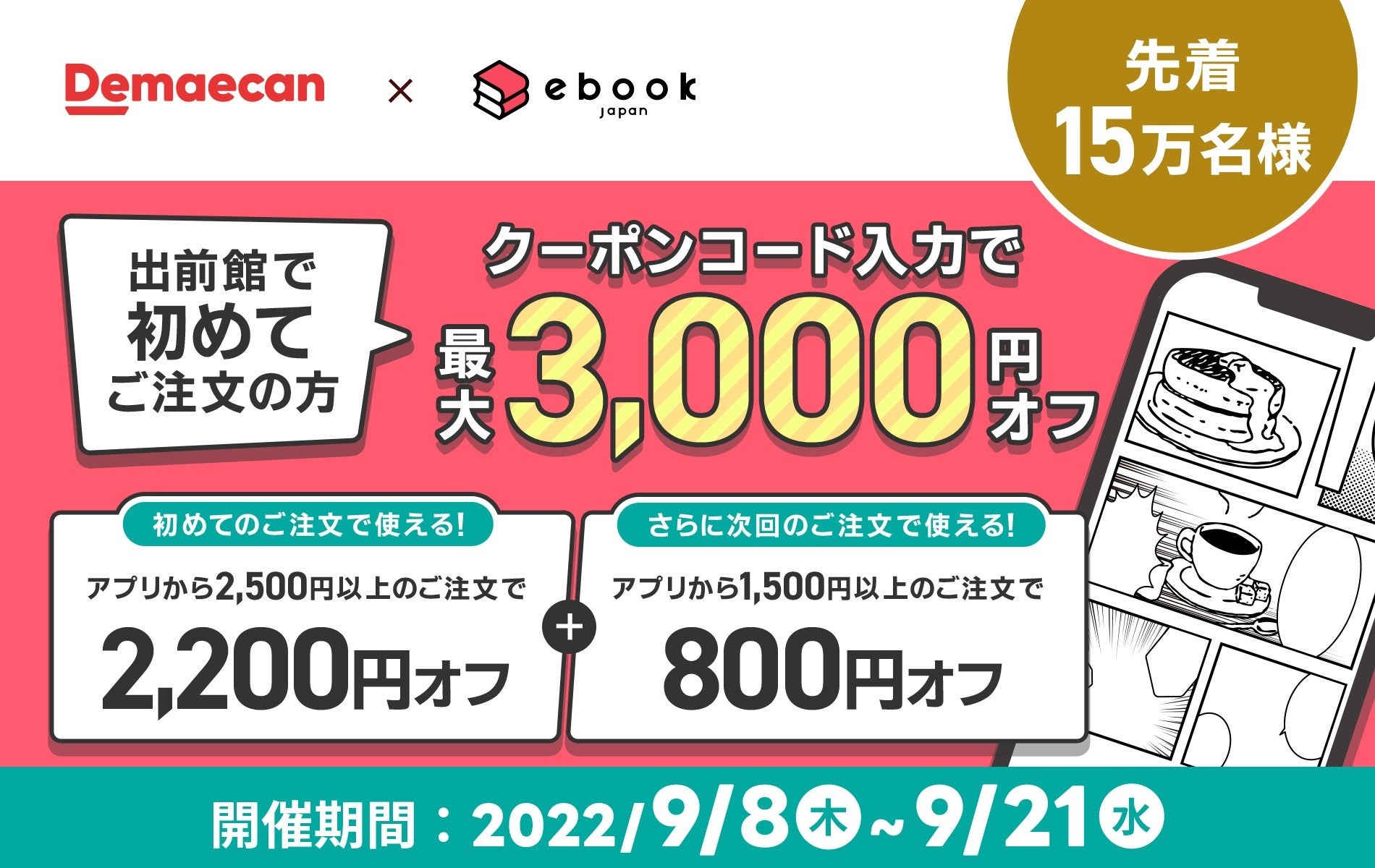 電子書籍販売サイト「ebookjapan」をヤフー株式会社と協力して運営する株式会社イーブックイニシアティブジャパンと、日本最大級のフードデリバリーサービス「出前館」を運営する株式会社出前館は、キャンペーンを2022年9月21日(水)まで実施します。