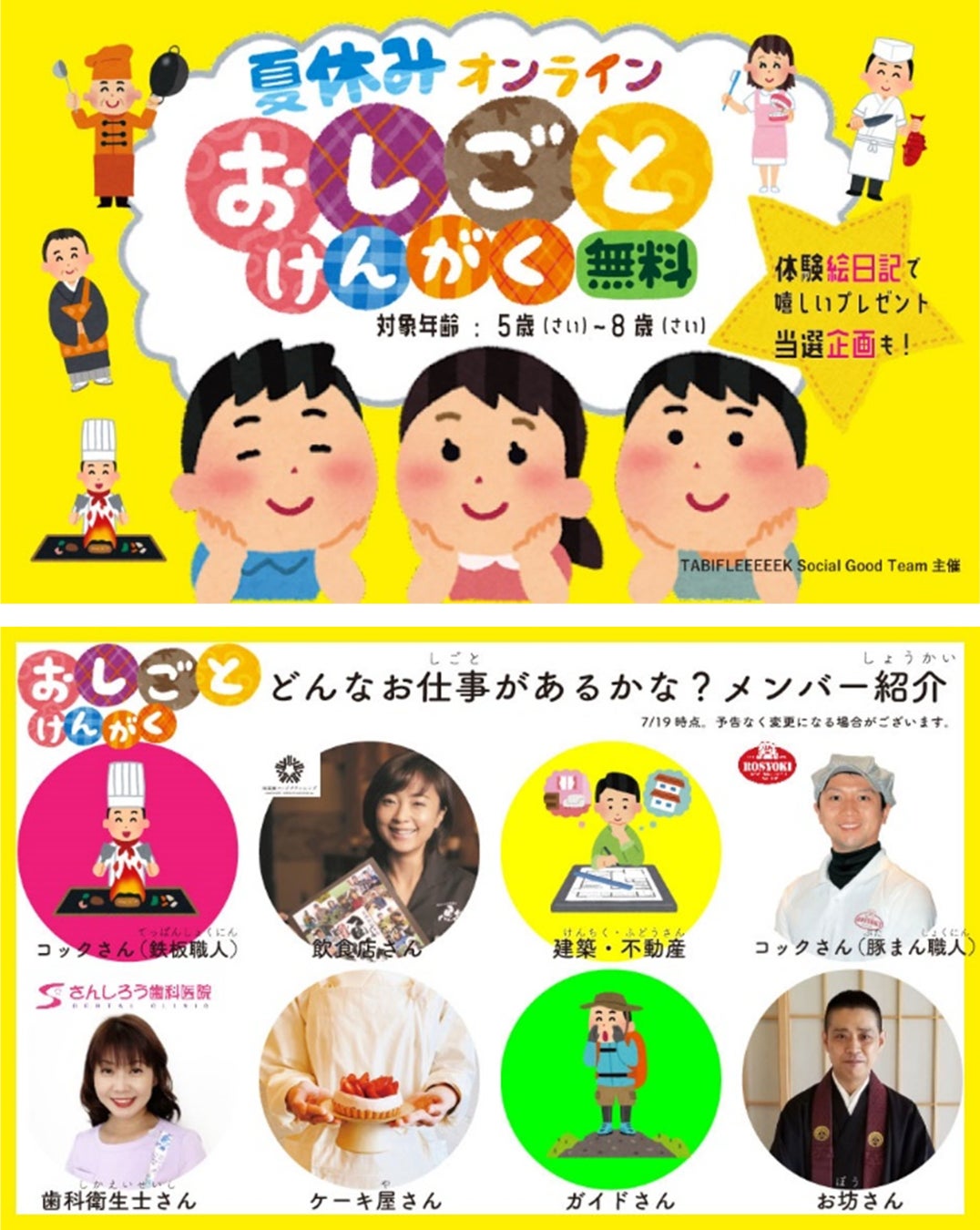 コロナ禍において学校行事が軒並み中止になり、さらには、経済や雇用に大きなダメージを与えたことにより世帯所得の格差が生じたことで、こどもの体験格差が生まれていると言われています。こども時代の体験は、積み重なり、今後の将来に大きな影響を及ぼします。「TABIFLEEEEEK」の有志メンバーで結成された「Social Good Team」では、この社会の課題に向き合い、少しでも解決の一助となれるよう、オンラインでおしごと見学ができる機会を無料でご招待するプロジェクトを開催いたします。オンラインで繋がることで、どこにお住まいでも参加ができ、こども達が様々なおしごとを見学していただくことが可能です。未来を担うこども達が選択肢を幅広く持ち、そして楽しく正しい知見を高めてもらい、学校や家庭の中で知り得ることができる範囲をこえ、あらゆる業種に触れることで、将来の夢を誰もが描けることに繋がればと考えております。