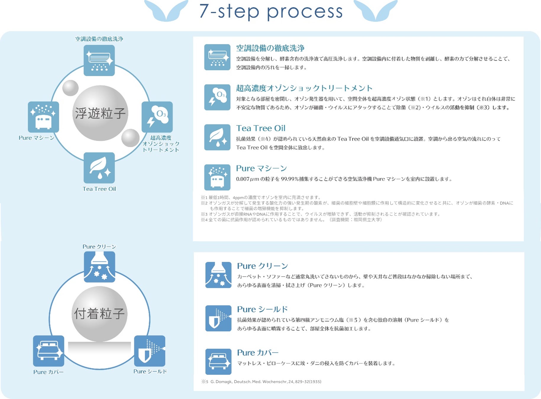 ※「7‐step process(セブンステップ プロセス)」(次項参照)と呼ばれる、米国特許取得済(US7767141B2)の室内清浄工程。空調設備の徹底洗浄、超高濃度オゾンショックトリートメント、Tea Tree Oil(ティーツリーオイル)、Pureマシーン、Pureクリーン、Pureシールド、Pureカバーの7工程を指します。