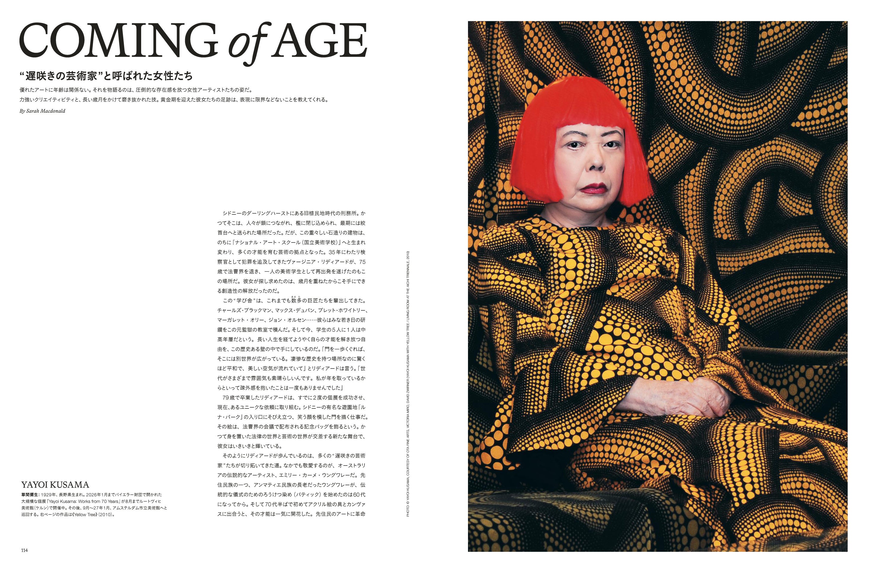 優れたアートに年齢は関係ない。それを物語るのは、圧倒的な存在感を放つ女性アーティストたちの姿。本企画では、草間彌生からルイーズ・ブルジョワ、マーガレット・オリー、エミリー・カーメ・ウングワレー、アンナ・メアリー・ロバートソン・モーゼス、アイリス・アプフェルまでを紹介します。後年になってから評価が高まった彼女たちの力強いクリエイティビティと、長い歳月をかけて磨き抜かれた技法による表現を解き明かします。
