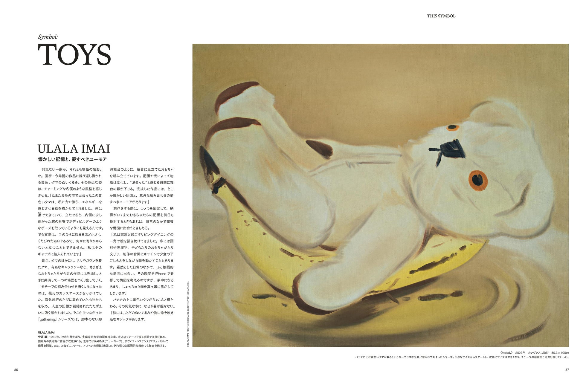 「たまたま蚤の市で出会ったこの黄色いクマは、私に力や強さ、エネルギーを感じさせる絵を描かせてくれました。でも実際は、手のひらに収まるほど小さく、くたびれたぬいぐるみで、何かに寄りかからないと立つこともできません。私はそのギャップに魅入られています」(今井麗)