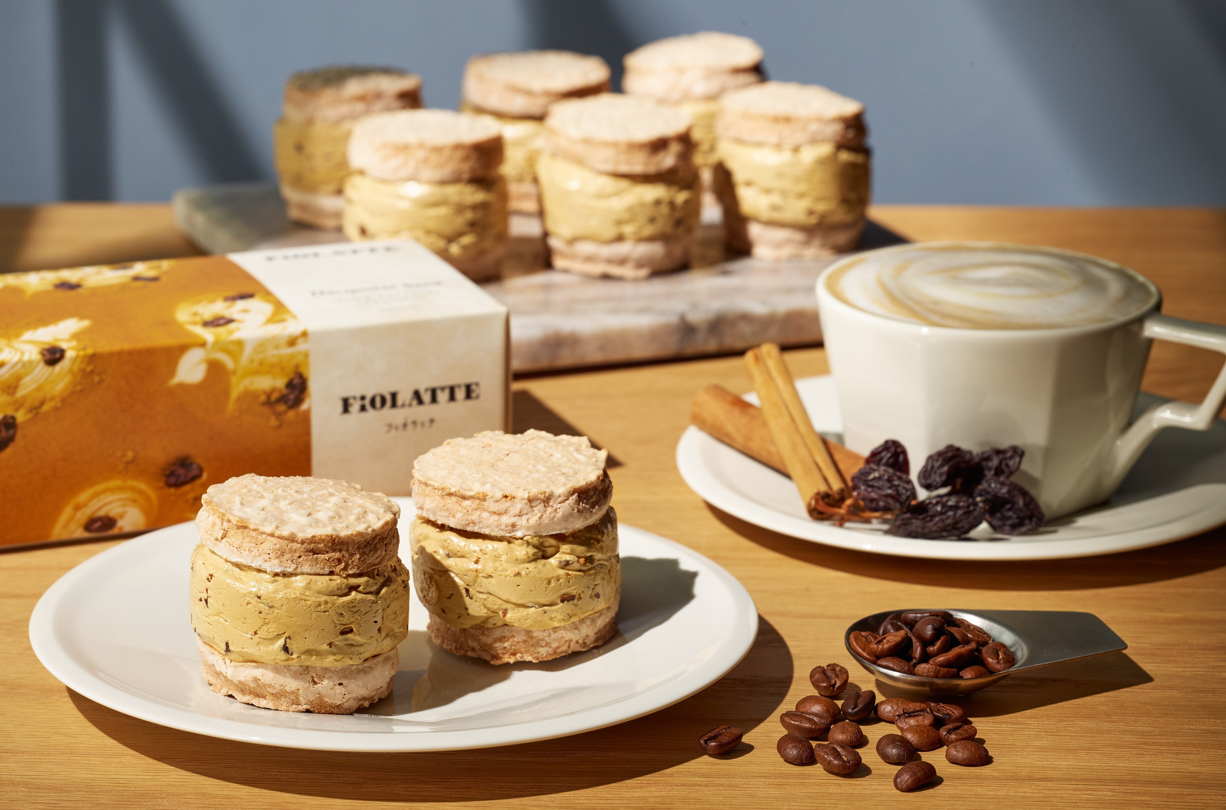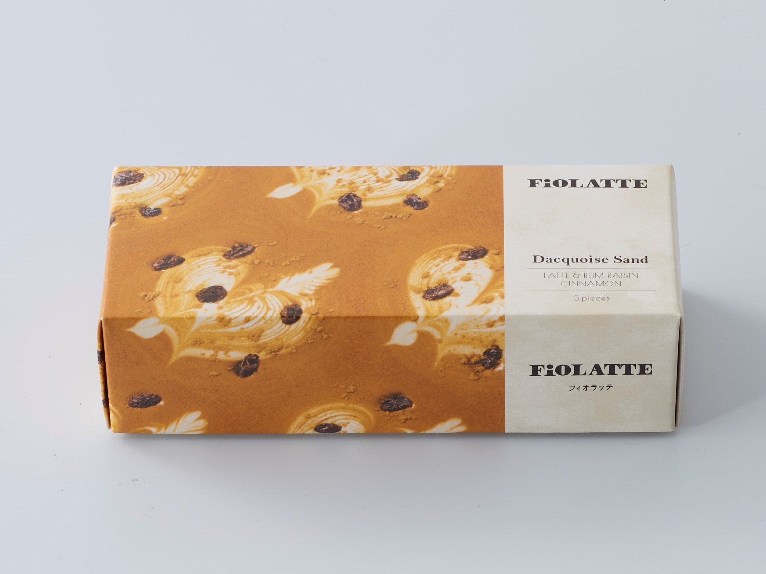 ラムレーズンを練り込んだカフェラテ風味の発酵バタークリームを、ほんのりとシナモンが香るサクサクなダックワーズ生地でサンドしました。華やかなカフェラテの薫りのなかに、ラムレーズンとシナモンのアクセントが楽しめる、とても濃厚で贅沢なお味の逸品です。