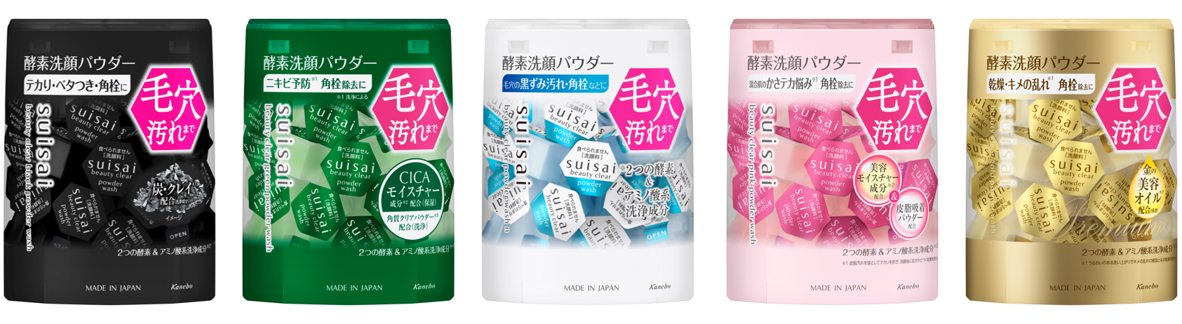「スイサイ ビューティクリア パウダーウォッシュ」シリーズは、肌悩みで選べる全5種をラインナップ!