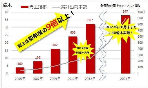 累計販売本数についても2012年度に10億本を突破し、2022年度10月末までになんと40億本以上(※2)、売上は発売初年度の9倍以上にまで成長しました。