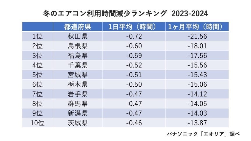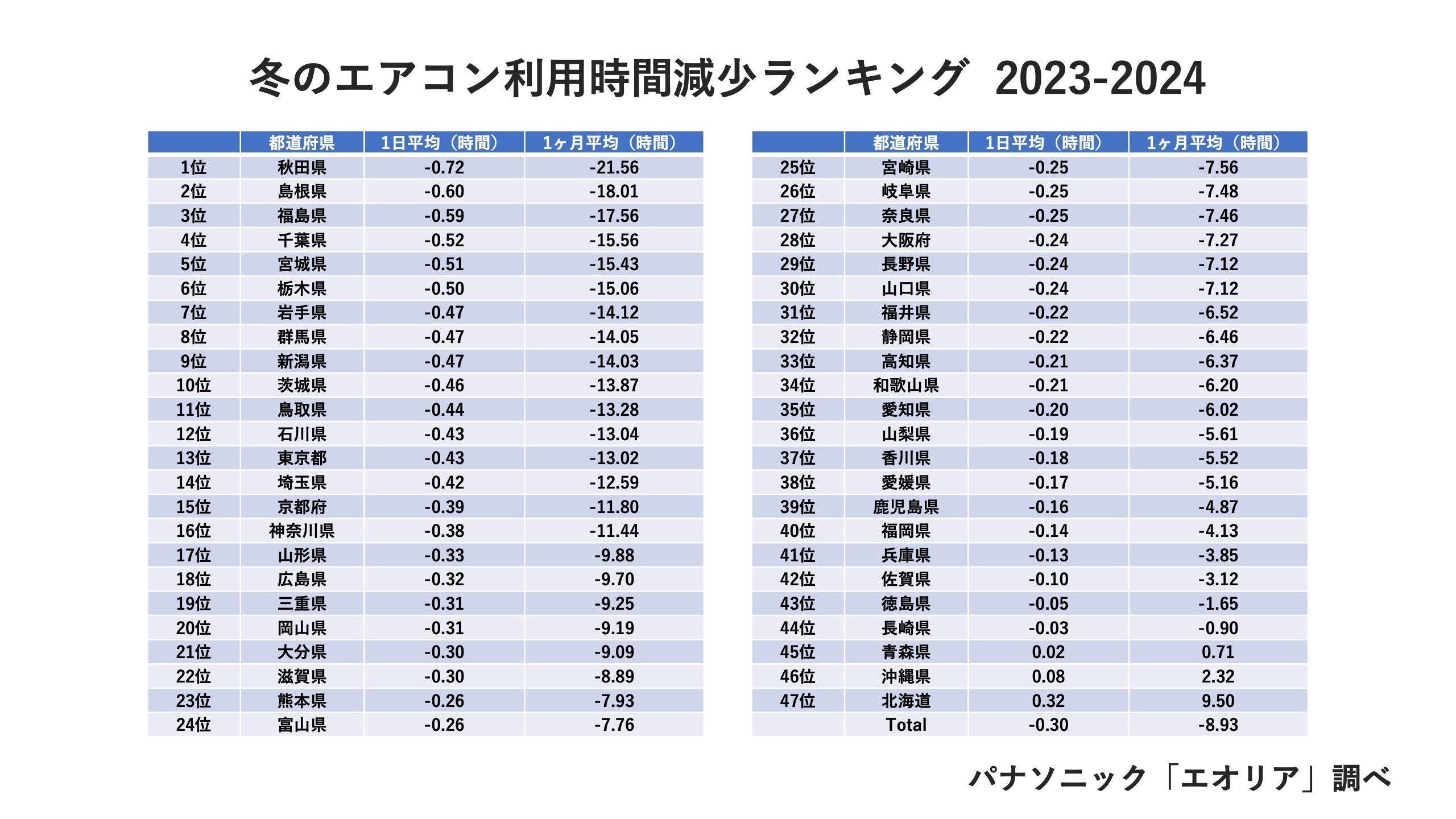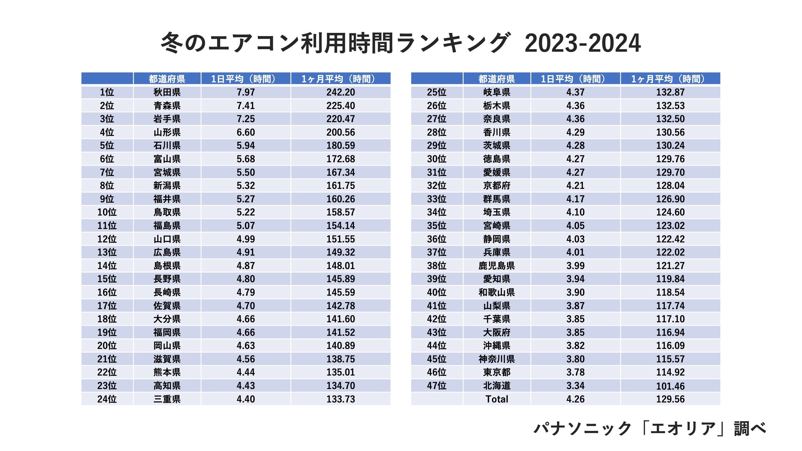 この度、パナソニック株式会社では、パナソニック エオリアユーザーの利用データをもとに「2023年-2024年 冬のエアコン使用実態調査」を実施し、都道府県別に今冬のエアコン使用時間を集計しました。