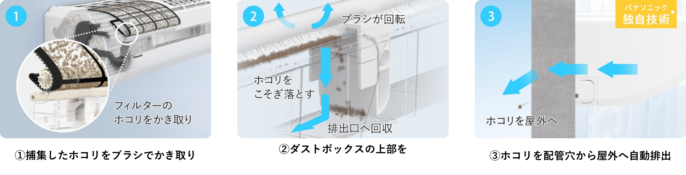 パナソニック エアコン「エオリア」に搭載された“フィルターお掃除ロボット”は、累積24時間以上運転すると、自動で掃除を始めるという機能を持っています。フィルターが自ら動き、びっしりと配置されたブラシでクリーニングすることで、フィルターのホコリをしっかりとかき取り、キレイに取り除いてくれます。さらに、ブラシについたホコリまでこそぎ落とし、排出口から屋外へ自動で排出してくれる※ため、ダストボックスにたまったホコリを捨てる手間もいりません。(自動排出タイプの場合)