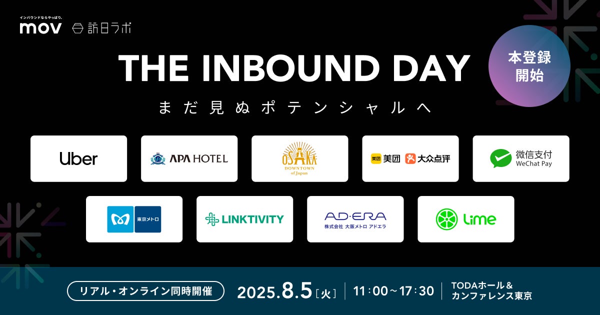 業界最大級のインバウンドビジネスメディア「訪日ラボ」を運営する株式会社mov(代表取締役:渡邊 誠、本社:東京都渋谷区、以下mov)は、2025年8月5日(火)にTODAホール&カンファレンス東京(東京都中央区)にて開催するインバウンドカンファレンス「THE INBOUND DAY 2025 -まだ見ぬポテンシャルへ-」の、参加チケットの申し込みを開始しました。