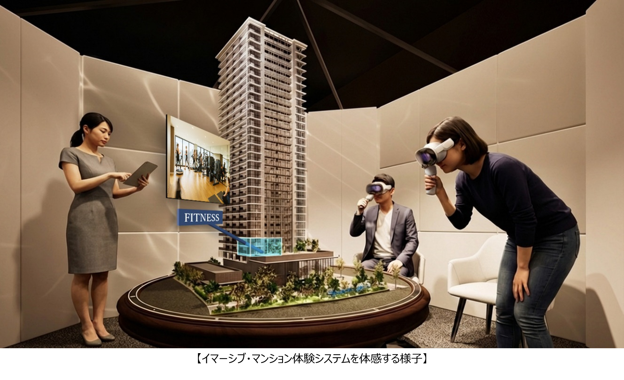 現実世界を認識し、その中にデジタル情報を配置することなどができる複合現実(XR)ヘッドセット「Apple Vision Pro」を販売活動で活用できるよう、アプリを株式会社スタイルポート・株式会社環境計画研究所と共同開発しました。それにより、以下をはじめとした体験が可能です。お客様はヘッドマウントディスプレイを覗くだけで、竣工前の物件であっても、よりリアルに近いイメージを体感いただいた上で、物件をご検討いただくことができます。