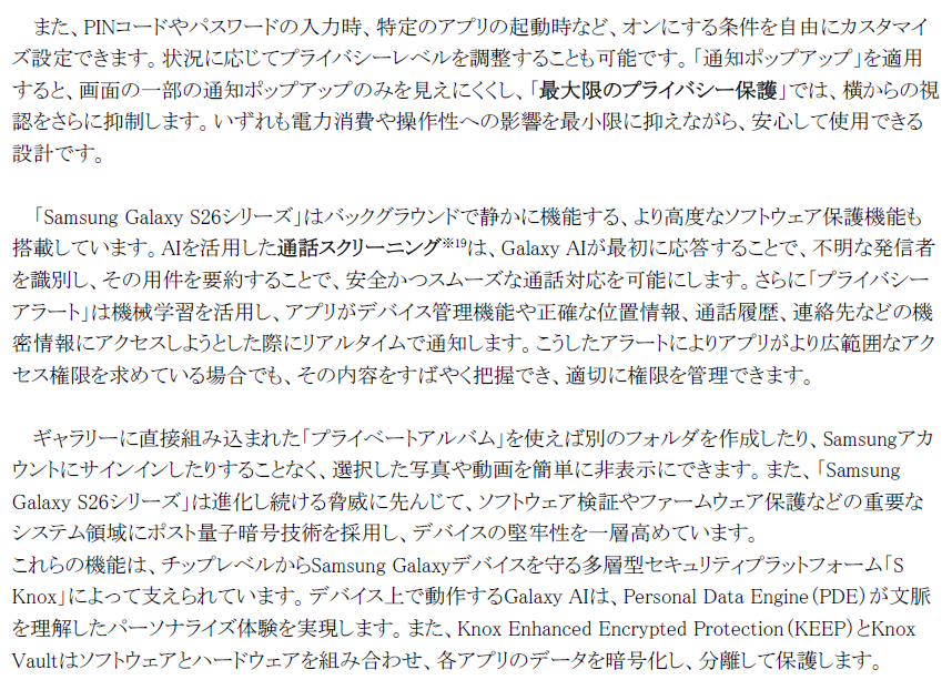 「Samsung Galaxy S26シリーズ」は、Samsungの誇る最先端の技術を結集し、比類なきパフォーマンス、最高峰のカメラシステムそして直感的なGalaxy AIが一体となって機能するよう設計されました。この盤石な基盤により、「Samsung Galaxy S26シリーズ」に搭載された高度な機能は一日中快適に利用可能で、且つユーザーはセキュリティやプライバシーを損なうことなく、安心してデバイスを使用することができます。