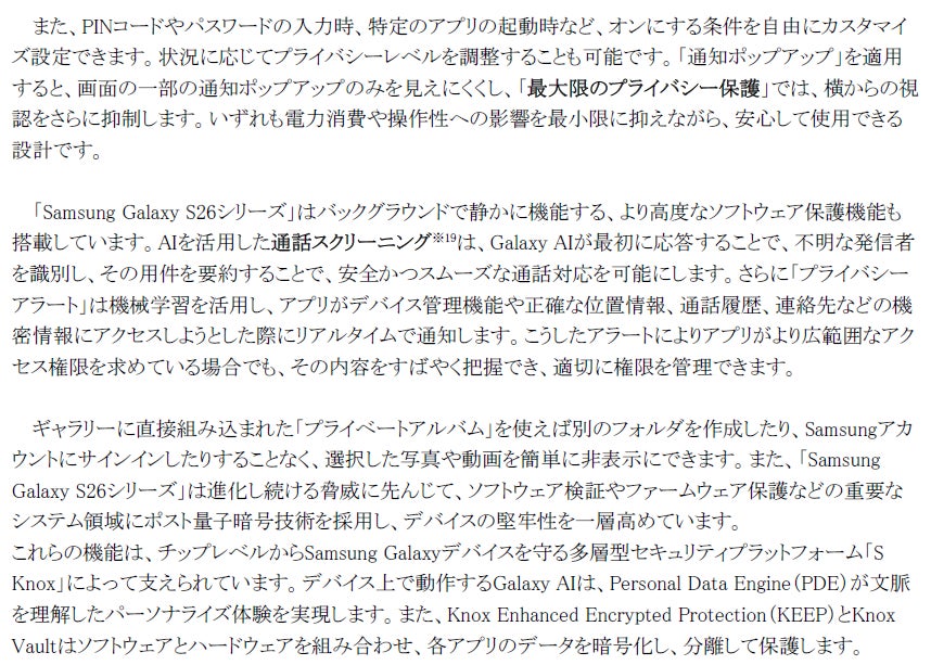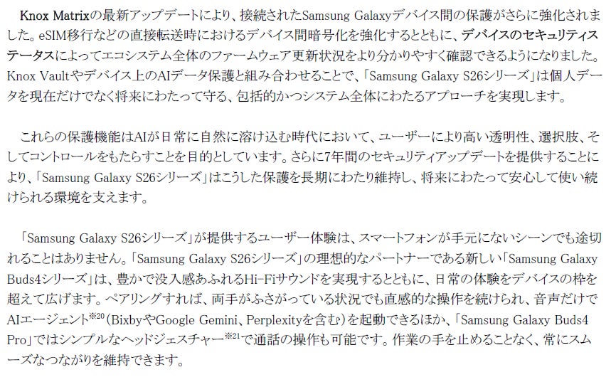こうした卓越した技術の融合により、「Samsung Galaxy S26シリーズ」はかつてないほど快適でパワフルなSamsung Galaxy体験を提供します。